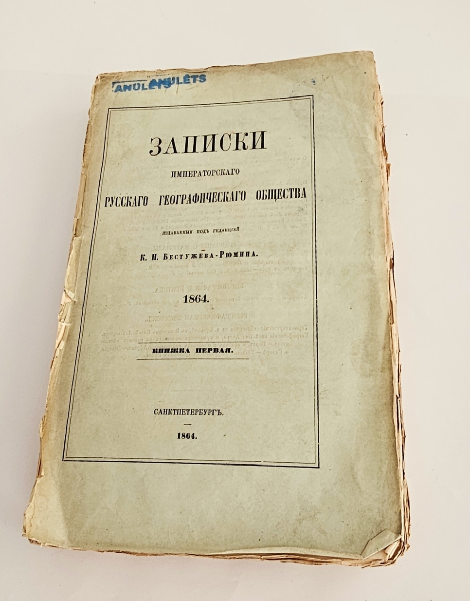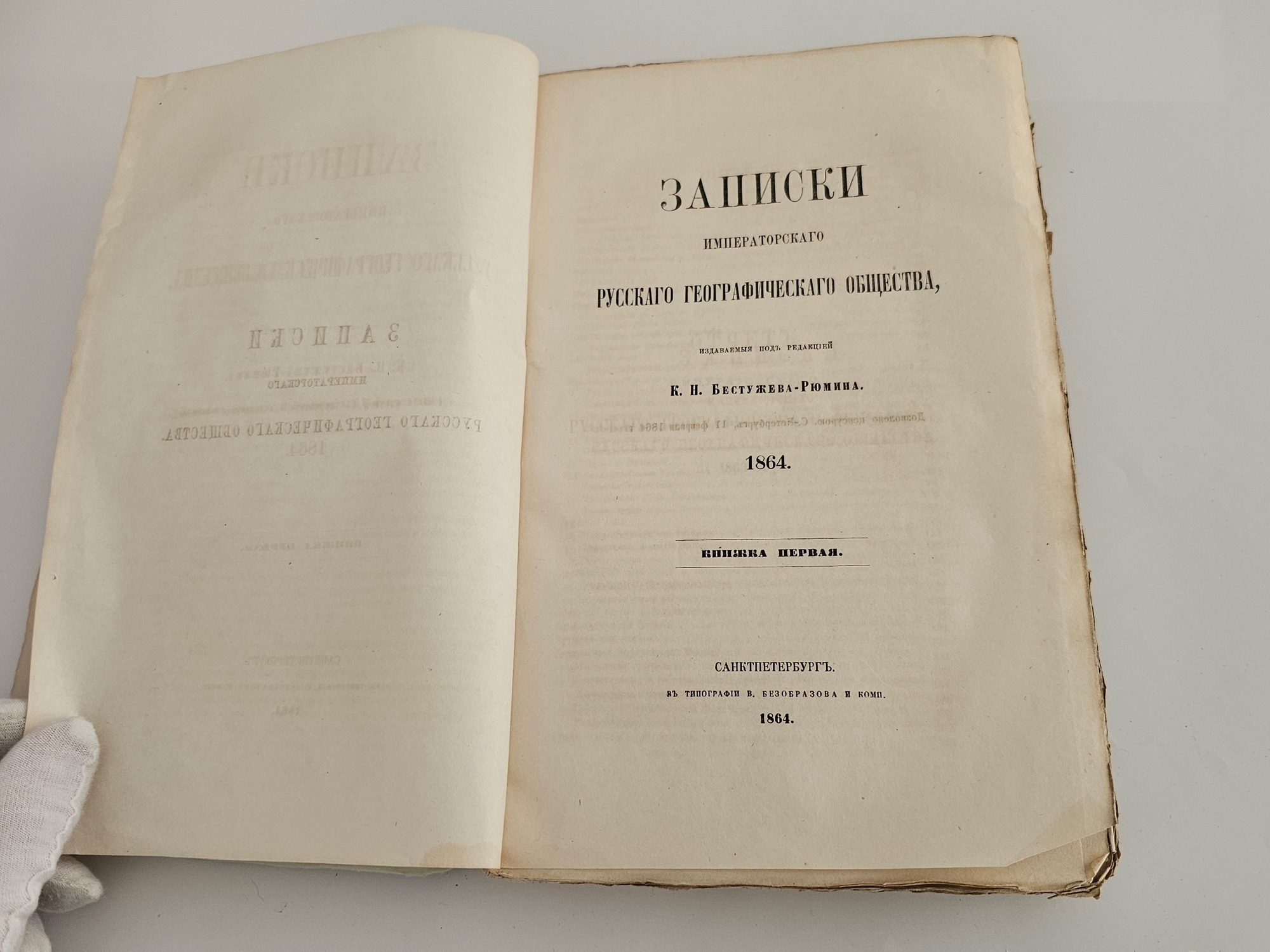 «Записки Императорского Русского географического общества. 1864. Книжка 1», изданная в Санкт‑Петербурге в типографии В. Безобразова и К° в 1864 году, представляет собой важный научный сборник своего времени. Книга в издательской обложке и содержит в общей сложности [4], [2], 211, [2], 146, 46, 50, 26, 28 страниц, а также три карты.