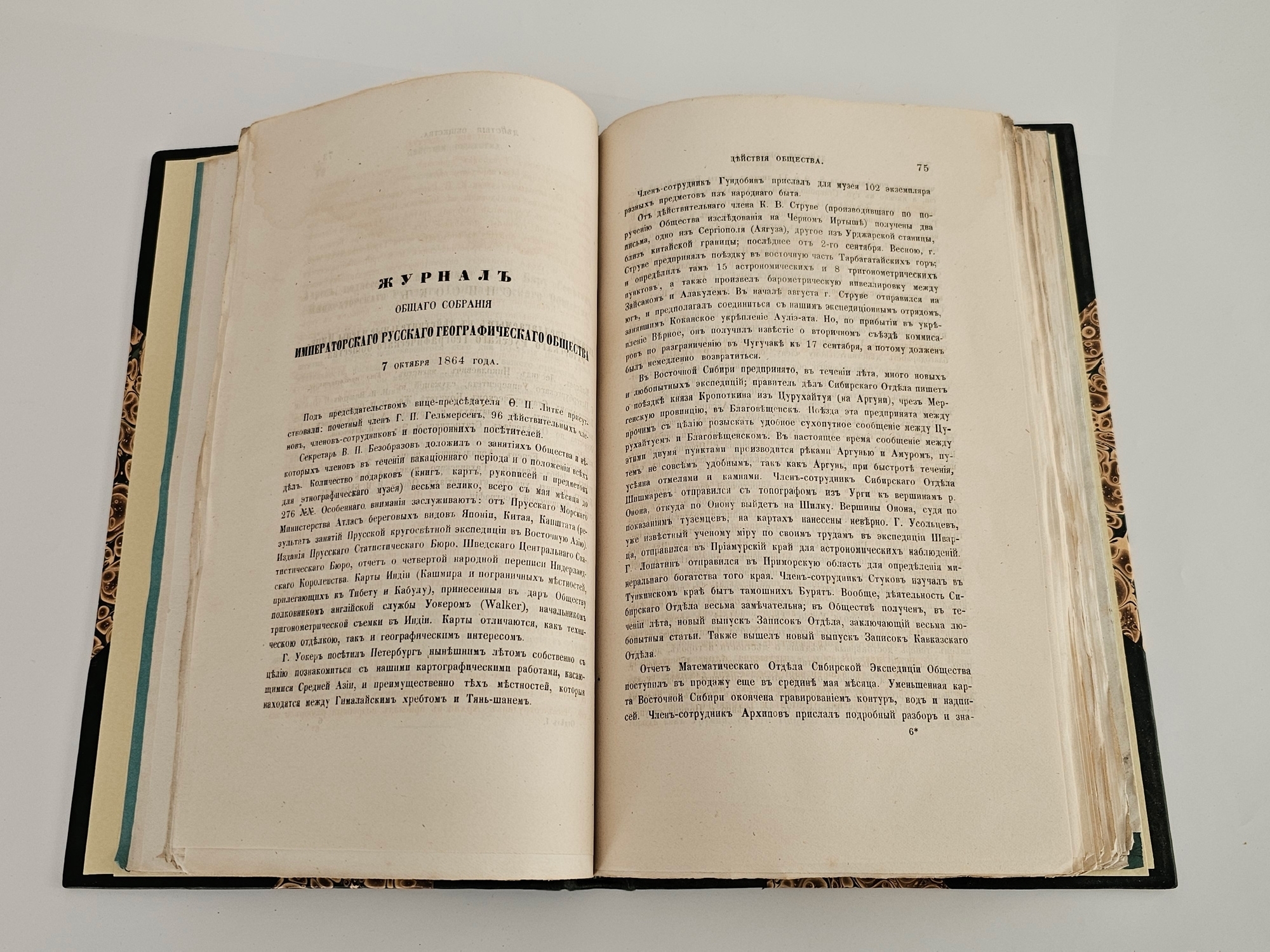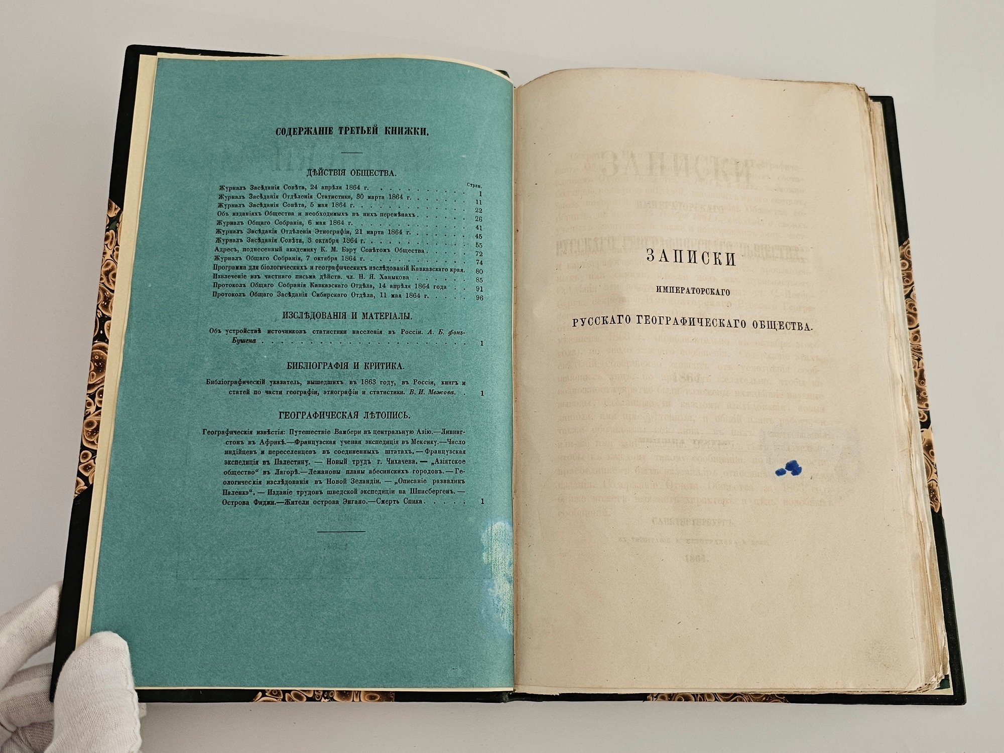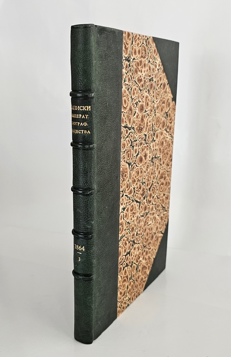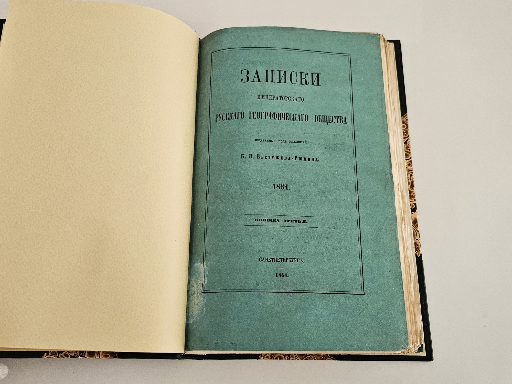 «Записки Императорского Русского географического общества. 1864. Книжка 3» изданы в Санкт‑Петербурге в типографии В. Безобразова и К° в 1864 году. Книга оформлена в полукожаный переплет в конце XX века, с сохранением издательской обложки. Блок необрезанный, есть подмокание от попадания воды в верхней части блока. Объём издания — [6], 98, 122, 78, 15, 2 страницы.