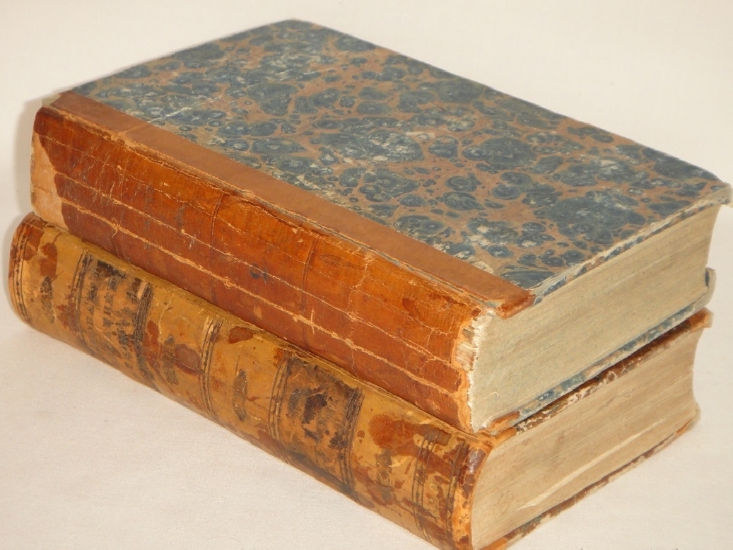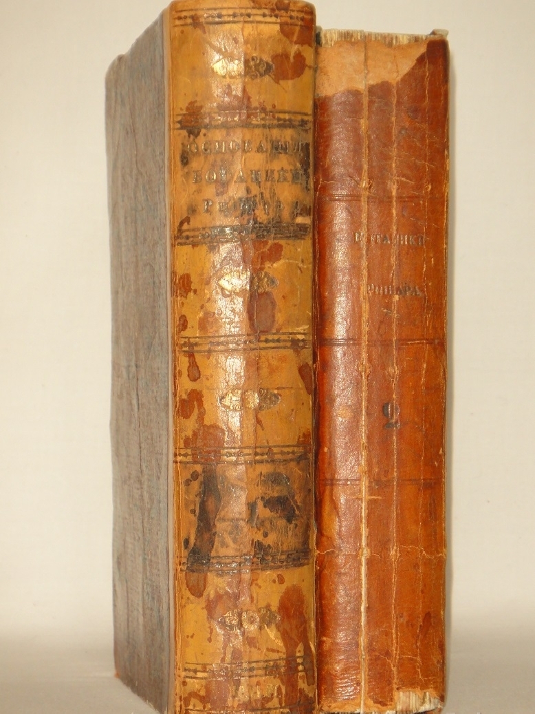 Экземпляр в двух полукожаных переплётах эпохи с блинтовым тиснением на корешках. Крышки с уголками оклеены бумагой под мрамор. Форзацы светлого тона. Краплёный обрез.