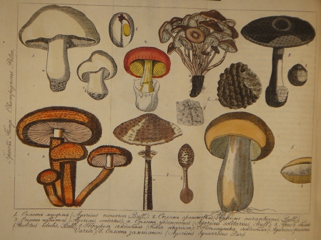 Издание украшено 57-ю полностраничными иллюстрациями, выполненными в технике гравюры на меди ( два листа: «Грибы» раскрашены вручную ). Пять гравированных складных таблиц с классификациями.