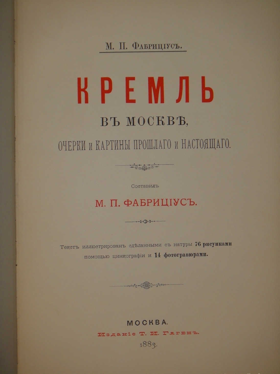 Роскошное иллюстрированное издание, выпущенное к празднованию Священного Коронования их Императорских Величеств Императора Александра III и Государыни Императрицы Марии Фёдоровны - и представляющее собой первый опыт монографического описания Московского Кремля. Его автор, чиновник особых поручений при Кабинете Его Императорского Величества, генерал-майор Михаил Платонович Фабрициус ( 1847-1895 ), почти десять лет руководил хозяйством Большого Кремлёвского дворца, участвуя в охране памятников архитектуры, в проведении экскурсий и в организации торжественных мероприятий. По долгу службы все эти годы он " жил среди памятников русской старины, оберегал их, следил за ними, вглядывался в них, проникался внутренним их значением ", изучал и " пробуждал в памяти своей воспоминания, с ними связанные ", что и позволило ему подготовить такой обширный труд.