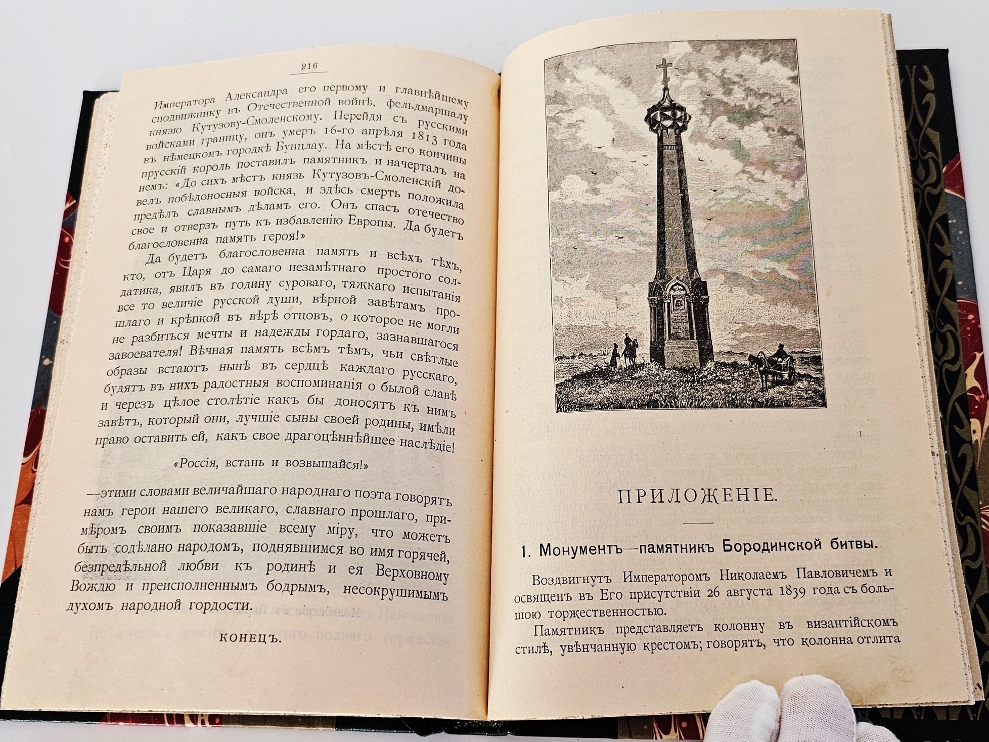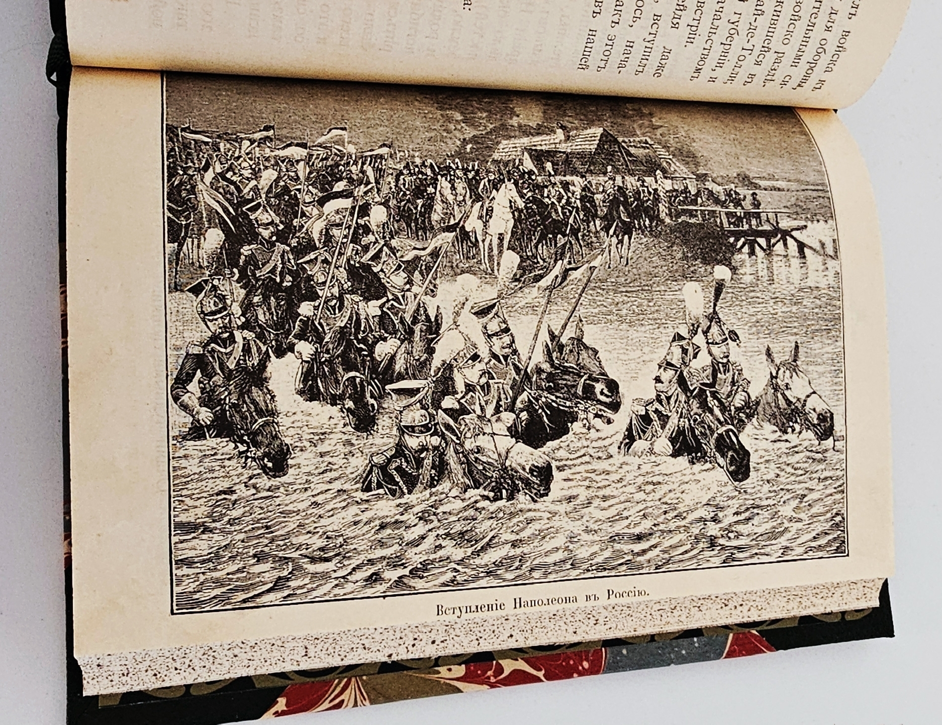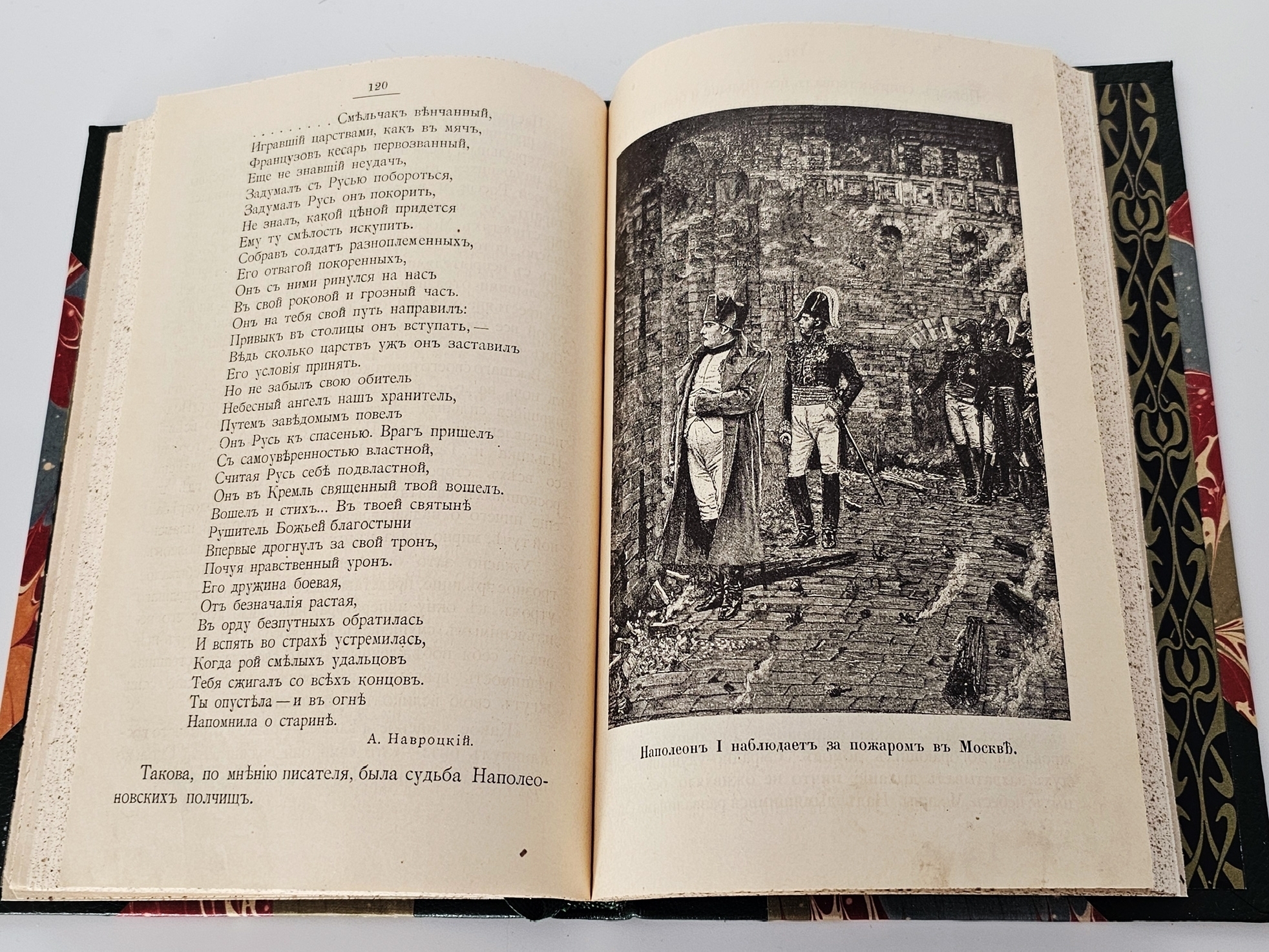 Книга в полукожаном современном переплете с золотым тиснением. 228 стр., сохранена мягкая издательская обложка. Множество иллюстраций в тексте, с раскладывающейся картой к описанию "Отечественной войны 1812г.". Формат: 21,5x15 см. Состояние книги очень хорошее.