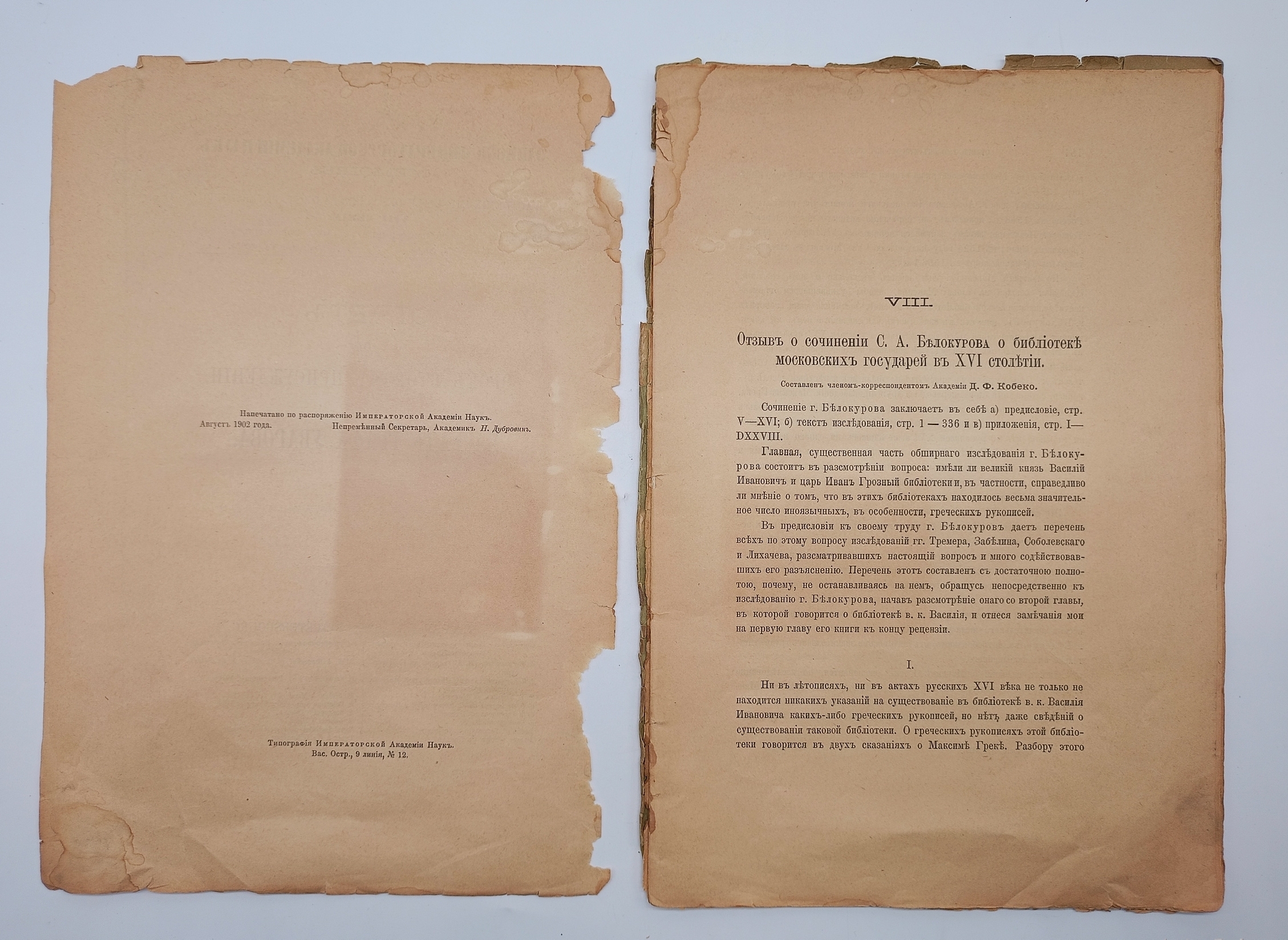 - Д.Ф.Кобеко. Отзыв о сочинении С.А.Белокурова о библиотеке московских государей в XVI столетии. 181-208 стр, 1 -2, 17-20 стр. и 1 лист оглавления.