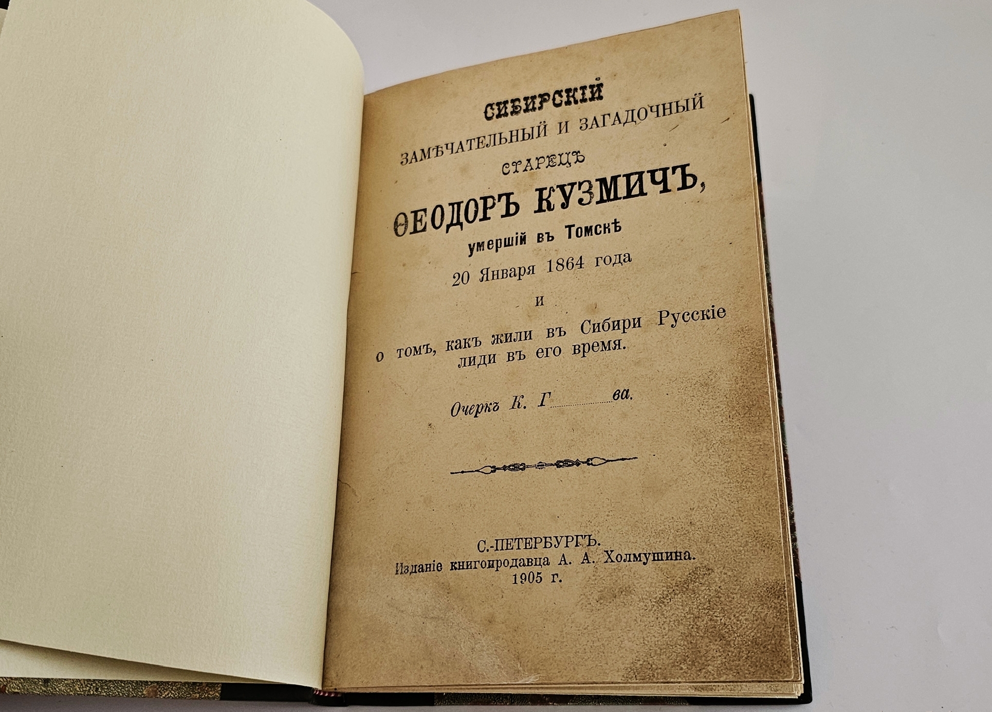 Книга вышла в Санкт-Петербурге в 1905 году. Автор, К. Г. ...в, вероятно, стремился не только рассказать о личности Фёдора Кузьмича, но и дать представление о жизни сибирского населения в его эпоху.