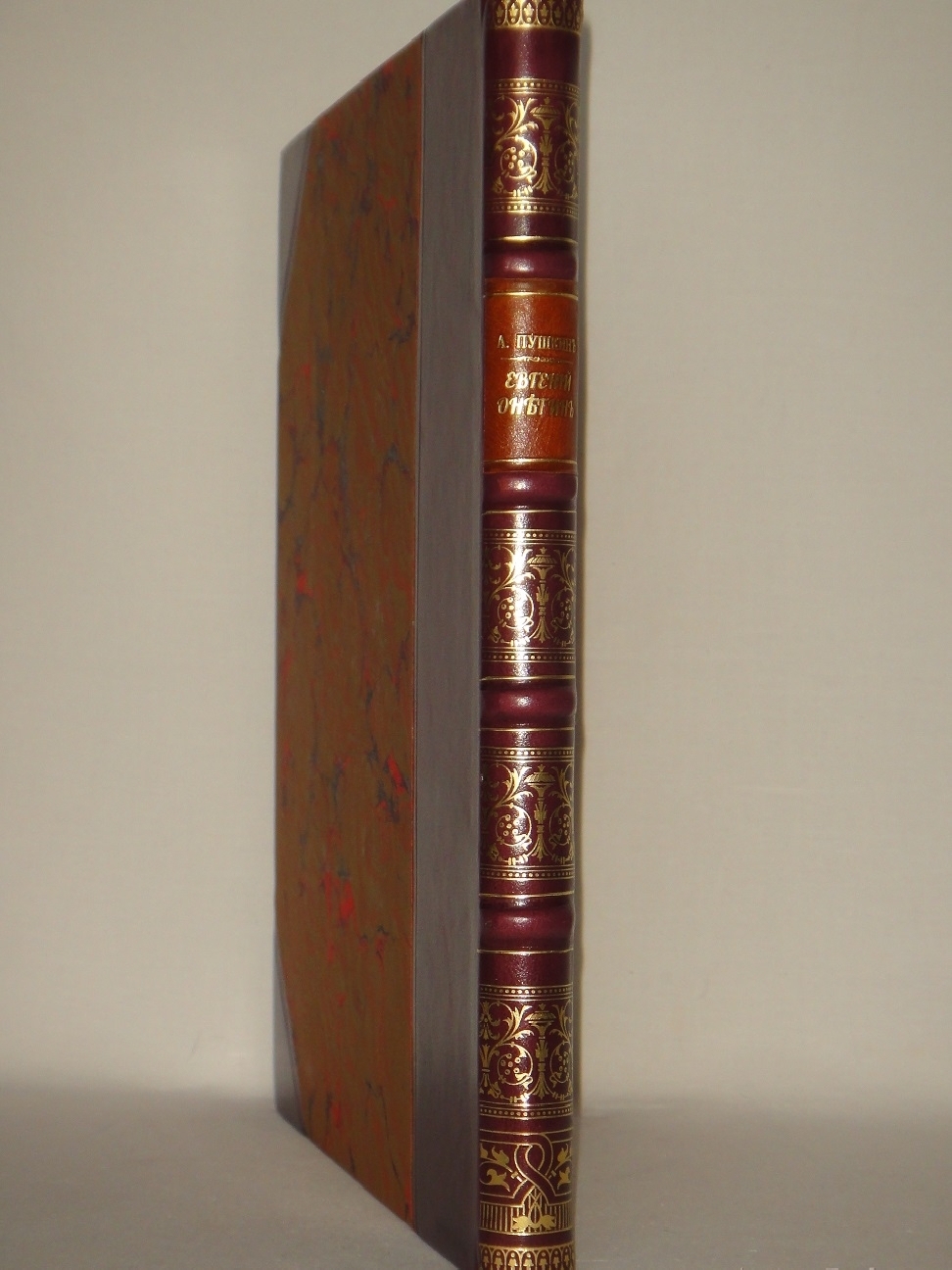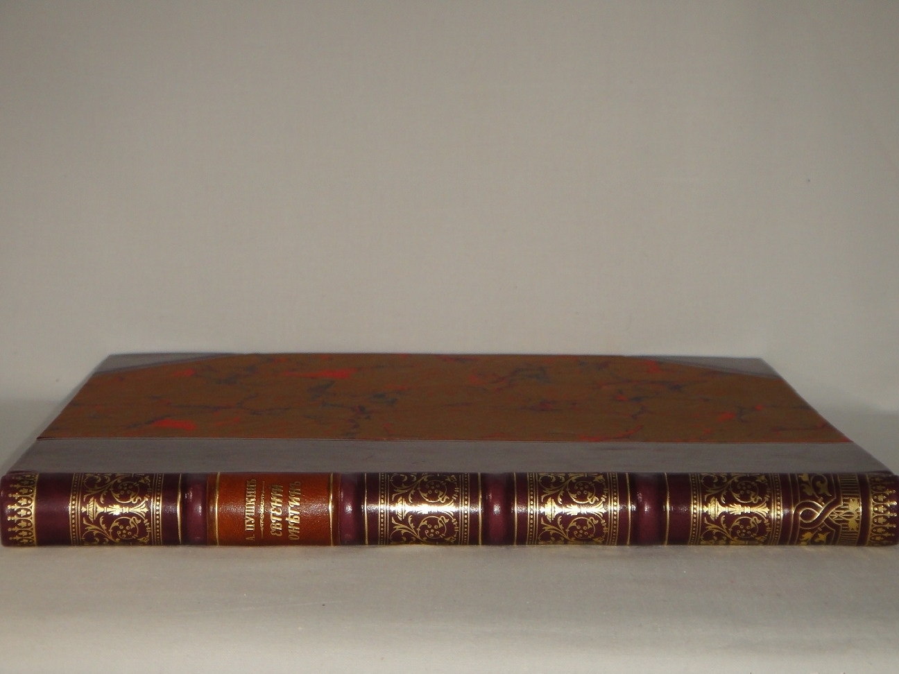 Экземпляр в великолепном полукожаном владельческом переплёте с золотым художественным орнаментальным тиснением на бинтовом корешке и контрастной декоративной вставке. Крышки с углами оклеены бумагой под мрамор.