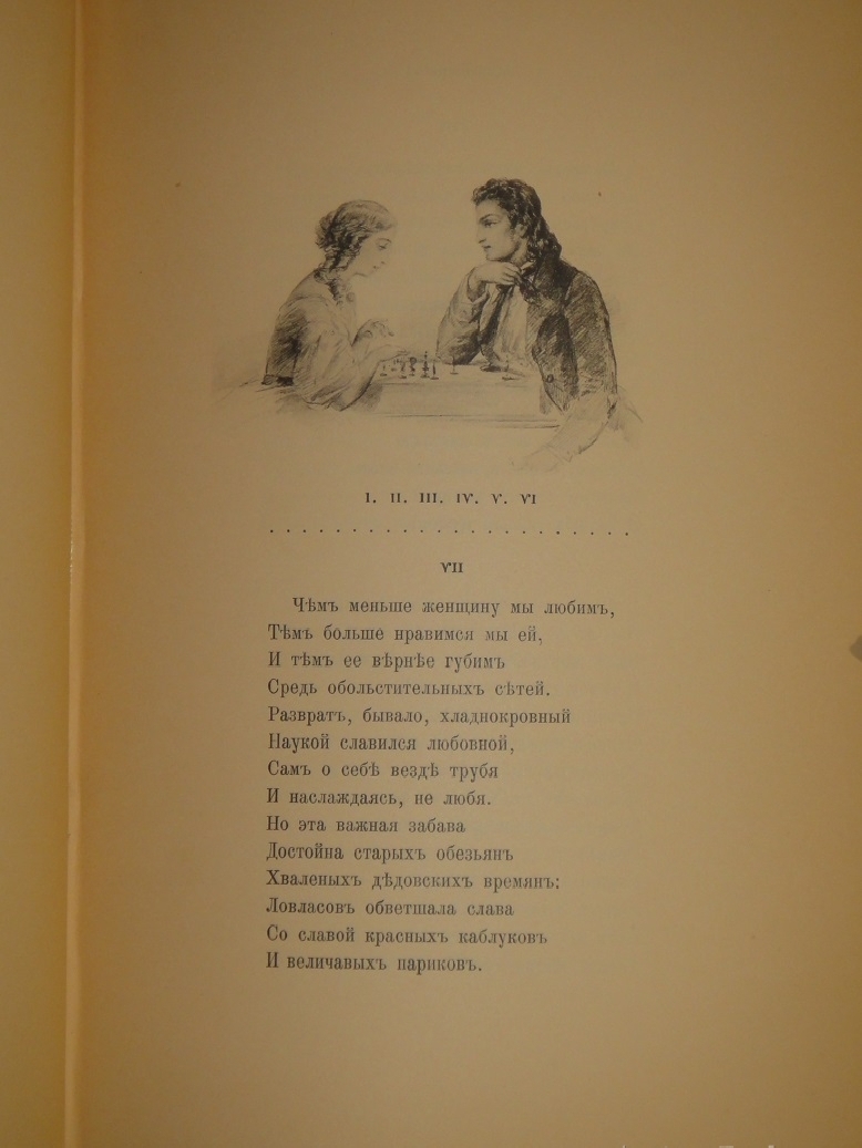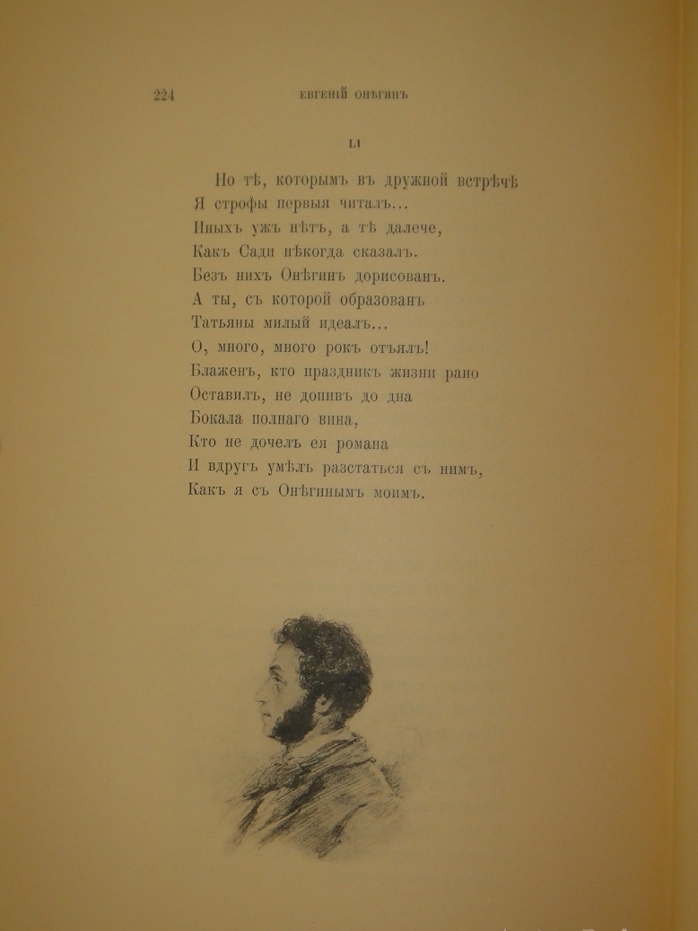 Знаменитое подарочное издание В.Г.Готье 1893 года с иллюстрациями академика живописи Павла Петровича Соколова, а также двумя рисунками художника-миниатюриста и графика Лавра Лавровича Белянкина, выполненными близко к стилю Соколова. Предыстория его появления на свет такова: различные издатели давно мечтали выпустить иллюстрированное издание " Евгения Онегина ", но чрезвычайно трудно было найти художника, который бы выполнил иллюстрации столь же точно, как и сам роман, передающие дух эпохи, адекватно отражающие настроение произведения, его характеры - всё то, что так дорого в нём каждому читателю. Задача была почти невыполнима, поскольку не было иллюстраций, современных пушкинской эпохе, и тем сложнее было их создать, чем дальше эта эпоха уходила в прошлое.