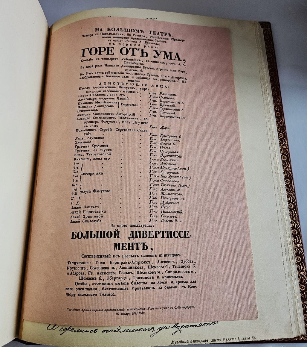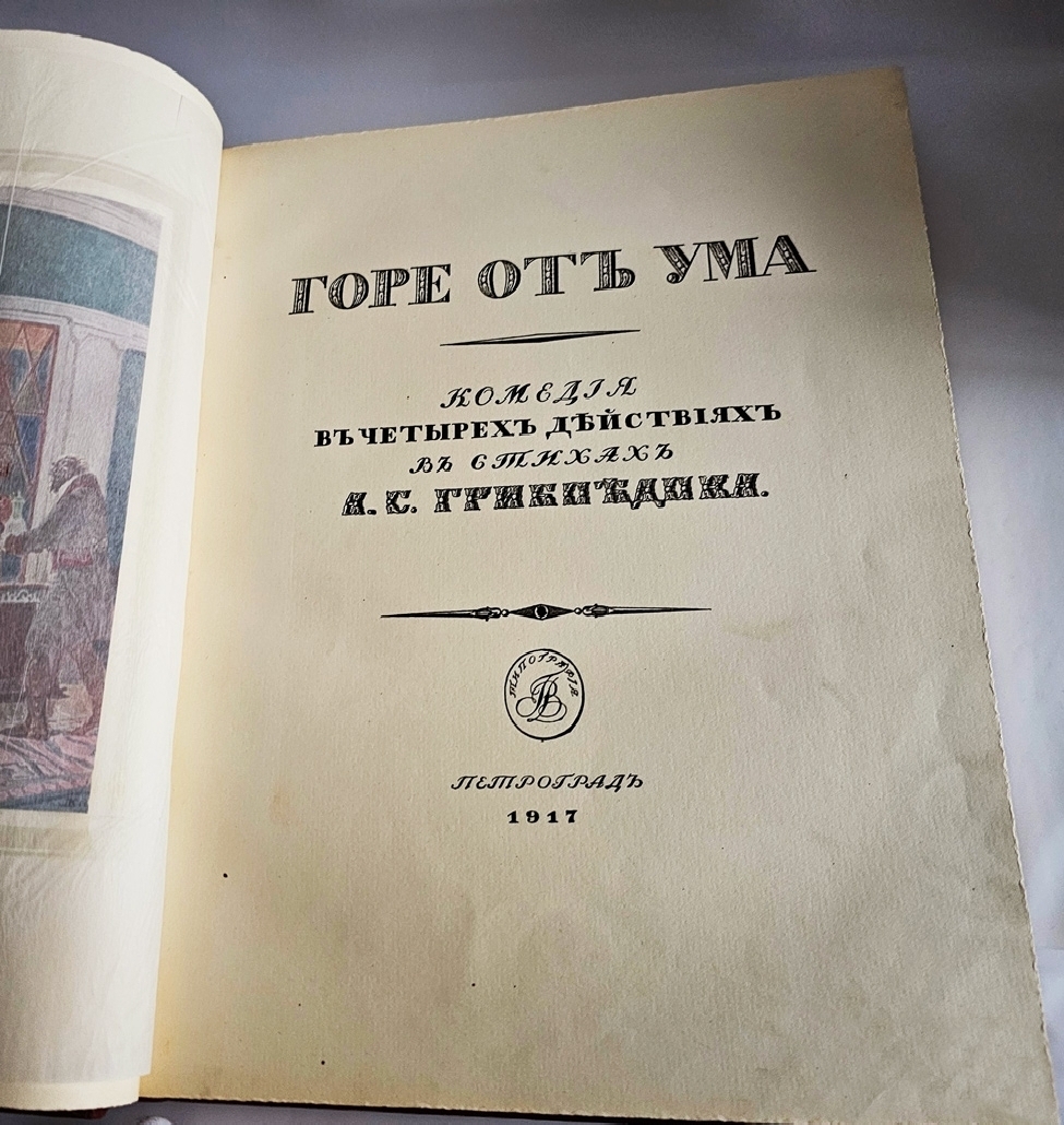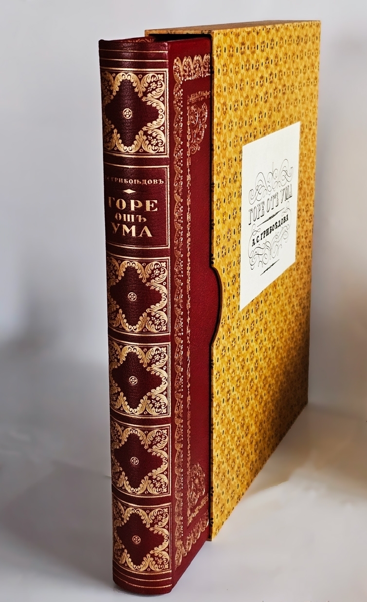 Роскошное подарочное издание бессмертной комедии А. С. Грибоедова «Горе от ума» (1823–1824), выпущенное в 1917 году одним из ведущих петербургских издательств — Товариществом Р. Голике и А. Вильборг. Книга представляет собой выдающийся образец книжного искусства Серебряного века: сочетание академически выверенного текста, фундаментального научного аппарата и изысканного художественного оформления делает это издание уникальным памятником русской культуры рубежа XIX–XX веков.