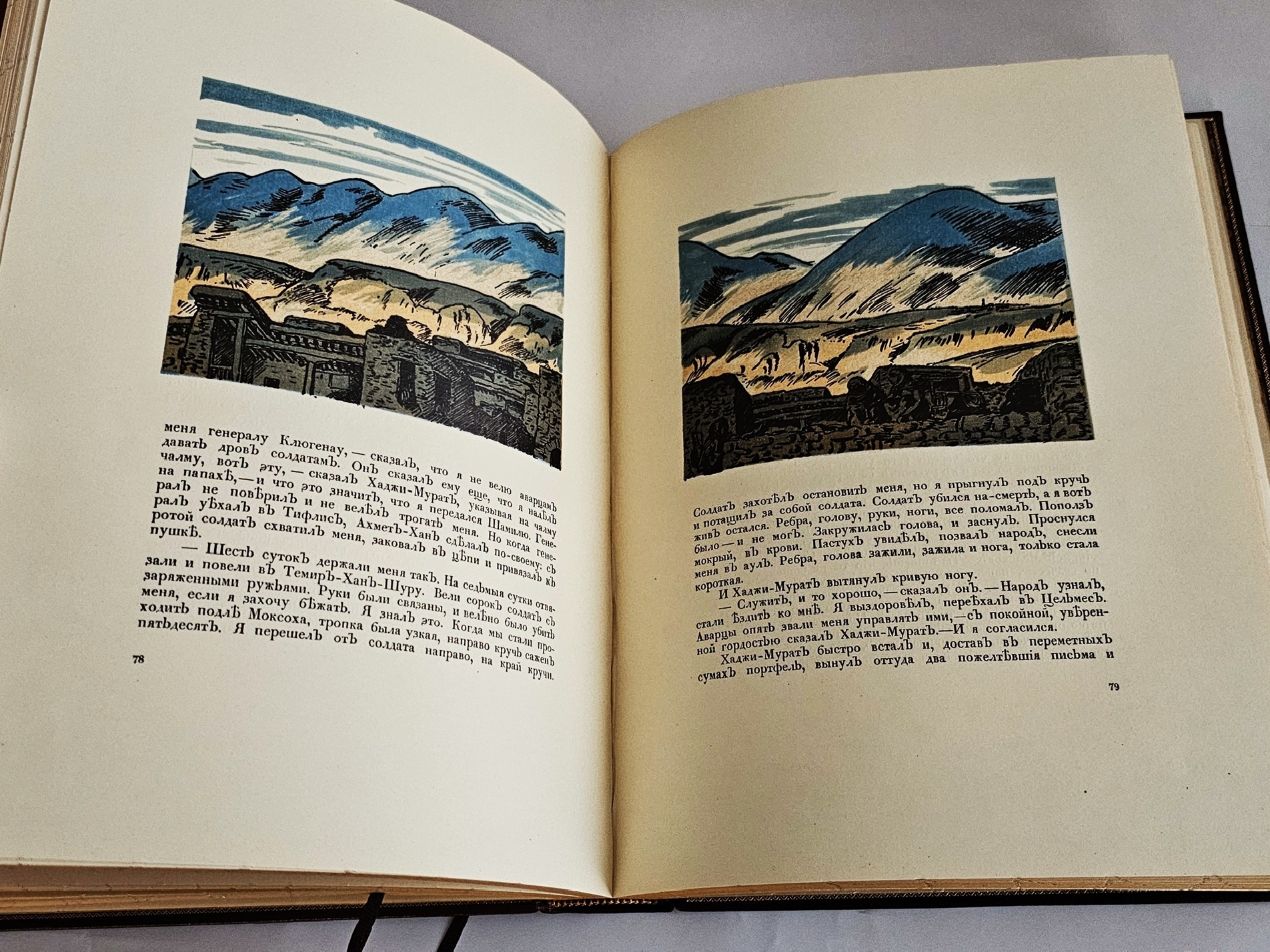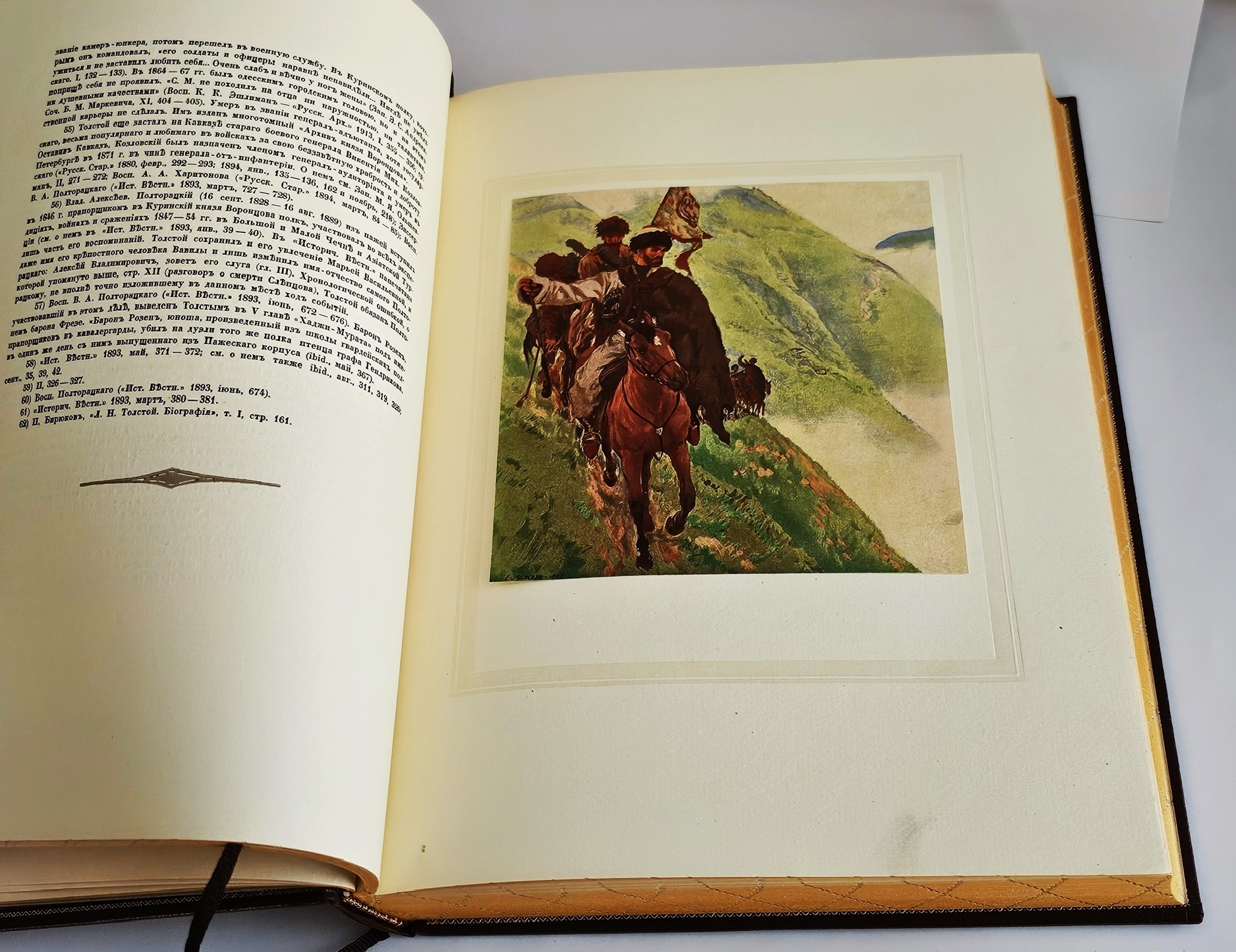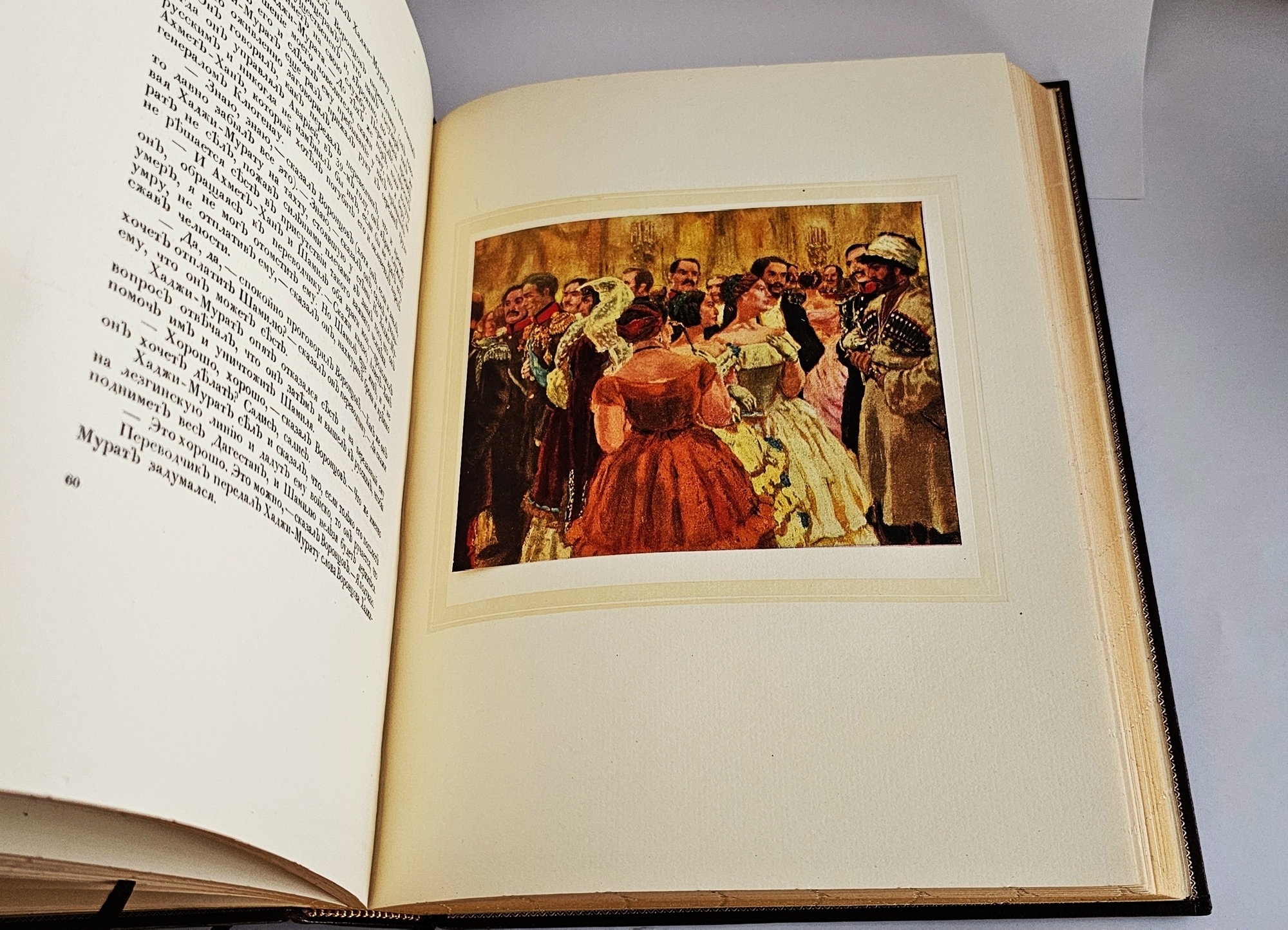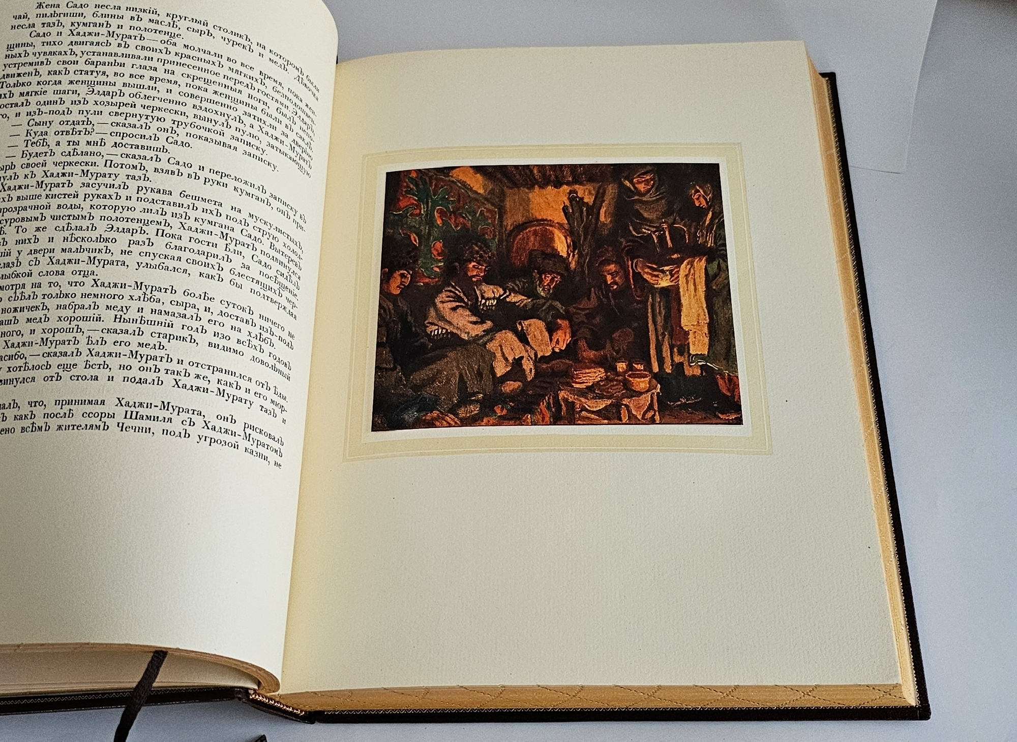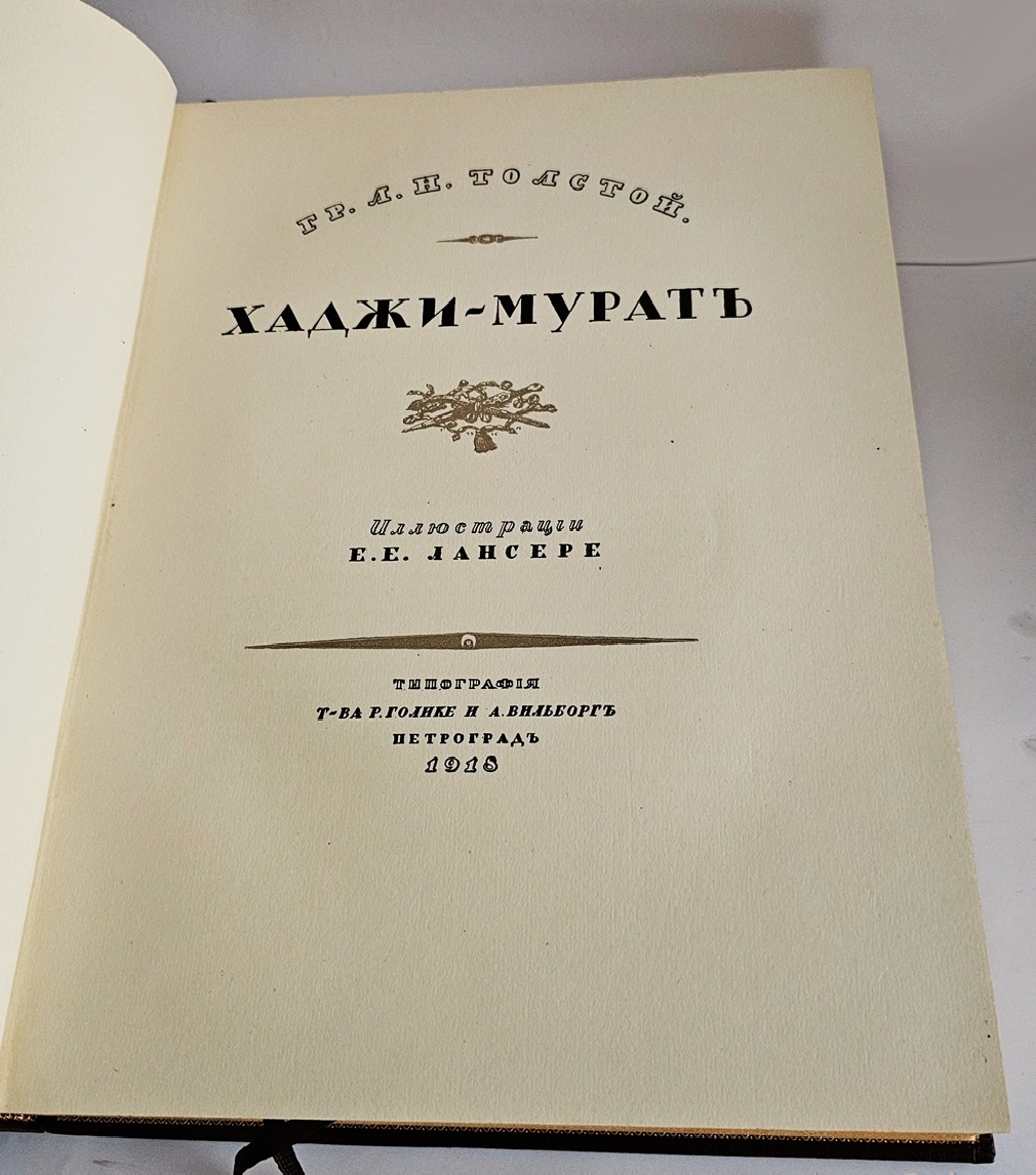 Антикварная книга в красивом современном цельнокожаном переплете с инкрустацией. На верхней крышке переплета - портрет Хаджи-Мурата, героя повести Л.Н.Толстого. Роскошное золотое тиснение по корешку. Золотой обрез с сеточкой. XXXII+162+XIII+[1] стр. Форзацы и золотая дублюра. Книга большого подарочного формата: 31x24 см. Качественная плотная вержированная бумага. С иллюстрациями выдающегося художника Е.Е. Лансере. Чистый красивый и редкий экземпляр.