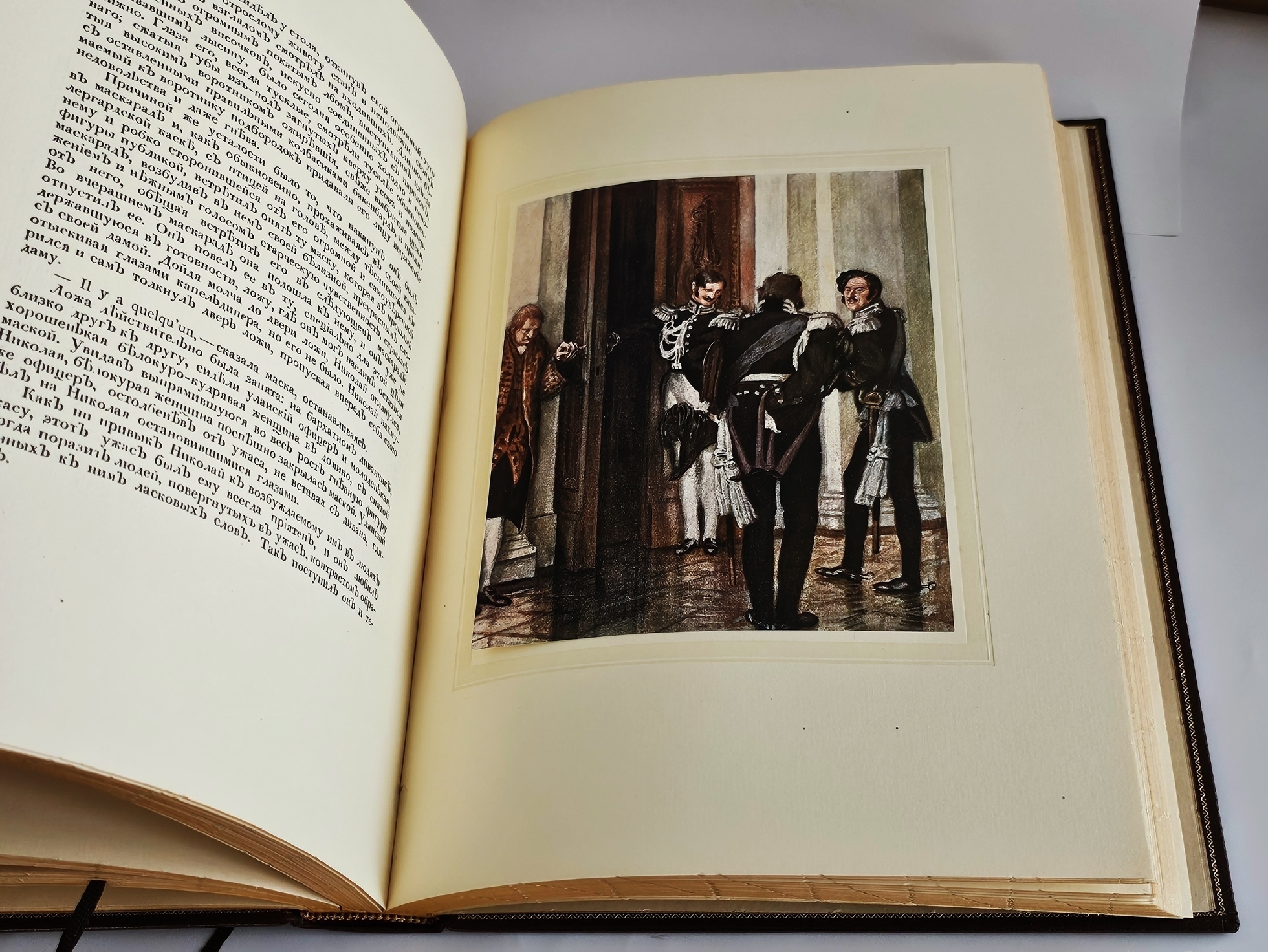 Это подарочное библиофильское издание, отпечатанное на плотной бумаге верже, с множеством иллюстраций работы художника Евгения Евгеньевича Лансере (1875-1946), выполненных, в том числе в цвете, в технике линогравюры, ксилографии и цинкографии.
