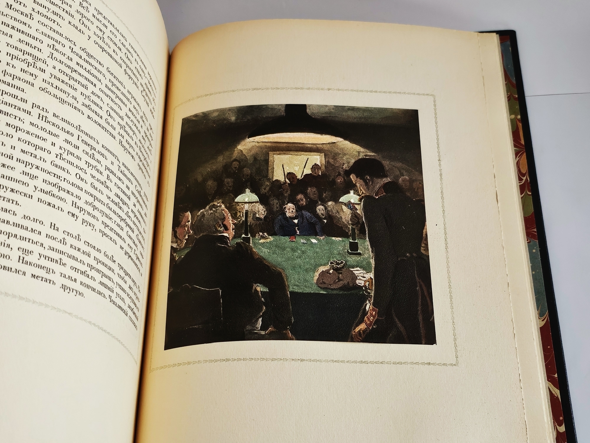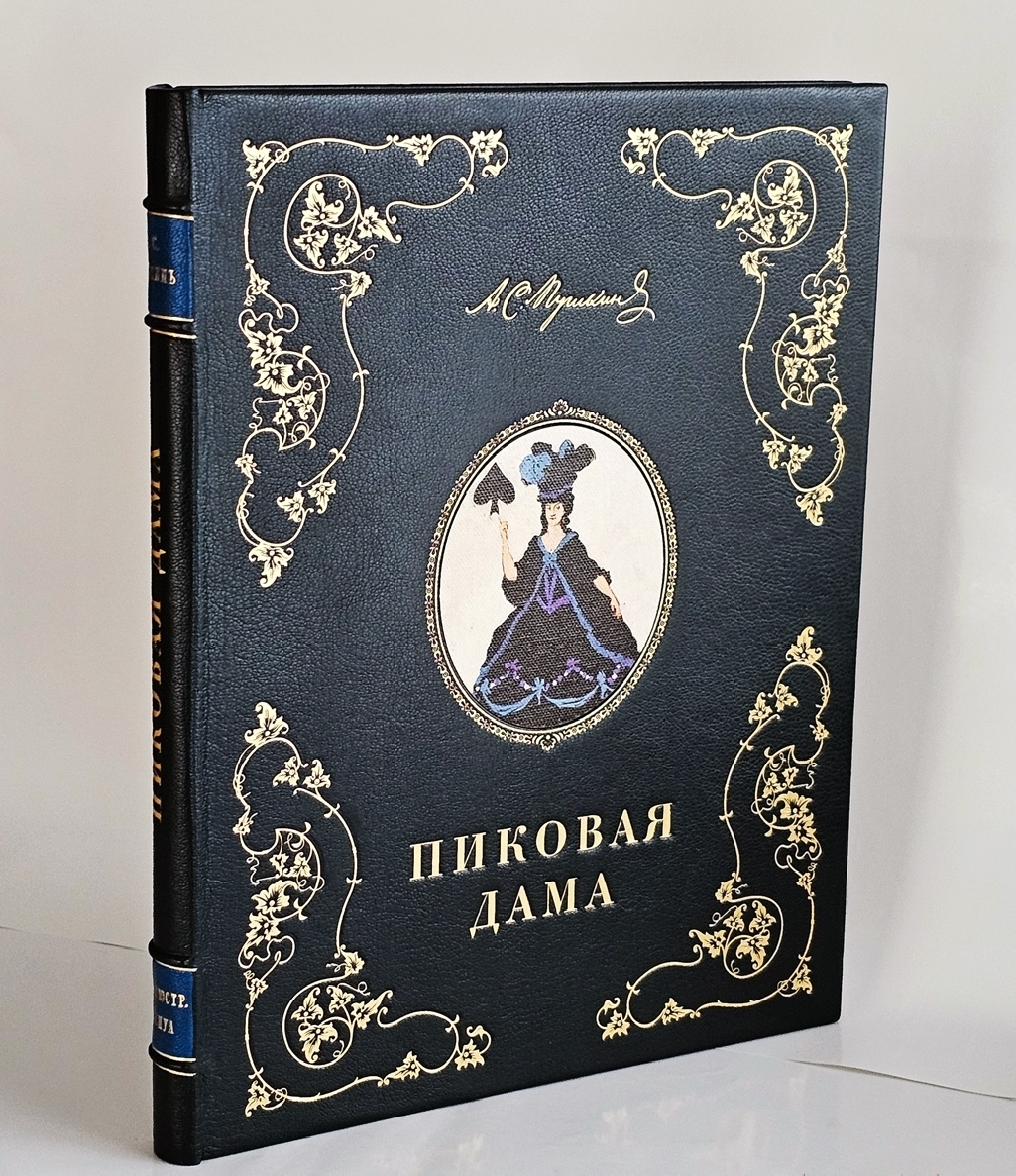 Книга в красивом оригинальном цельнокожаном современном переплете с изображением пиковой дамы на верхней крышке переплета. Форзацы павлинье перо. Большой формат: 31x25 см. Плотная качественная бумага. С иллюстрациями. [4], XXII, 65, [3] стр.; фронтиспис (цв. илл.) + 7 цветных иллюстраций. Состояние отличное.