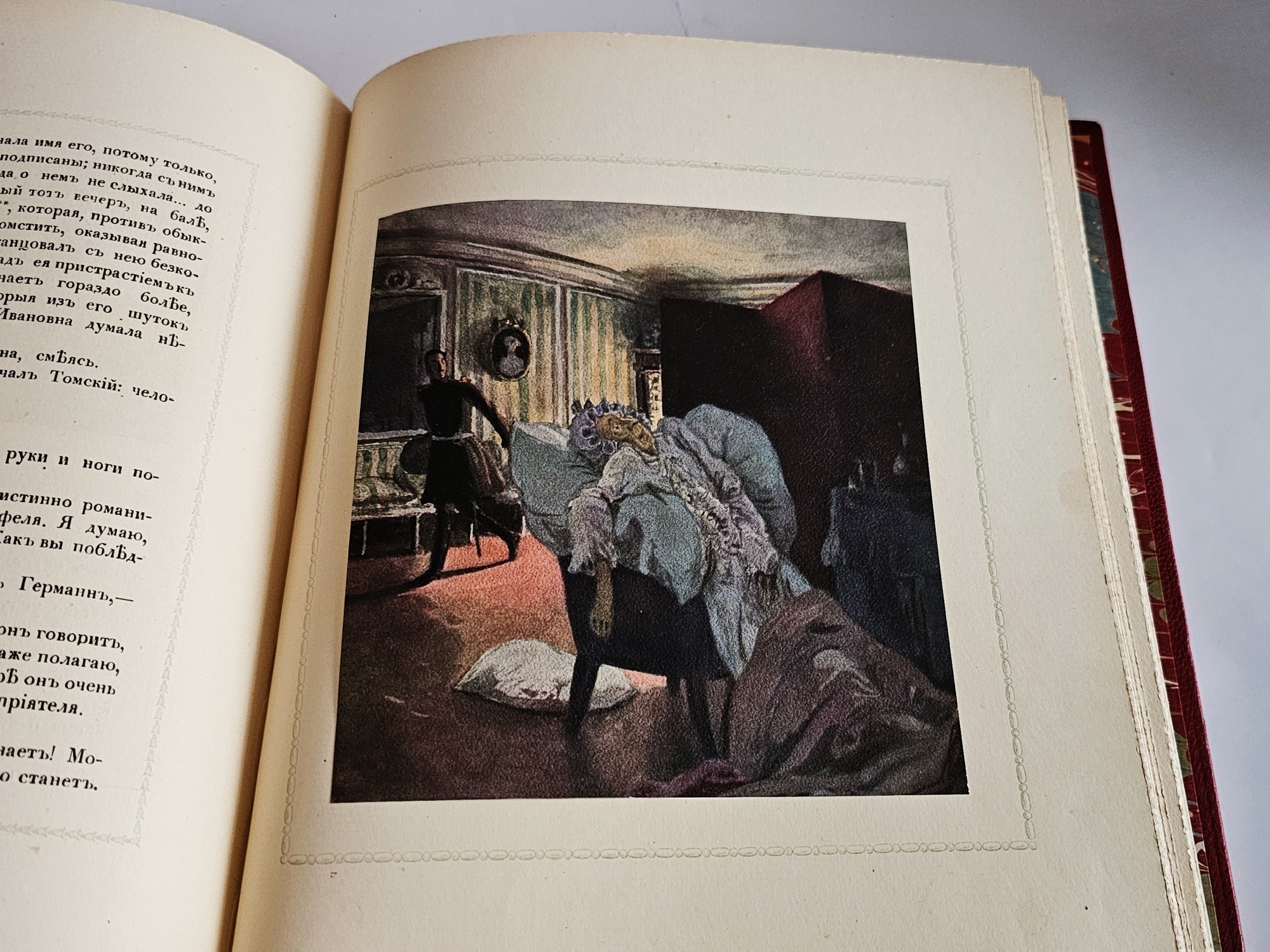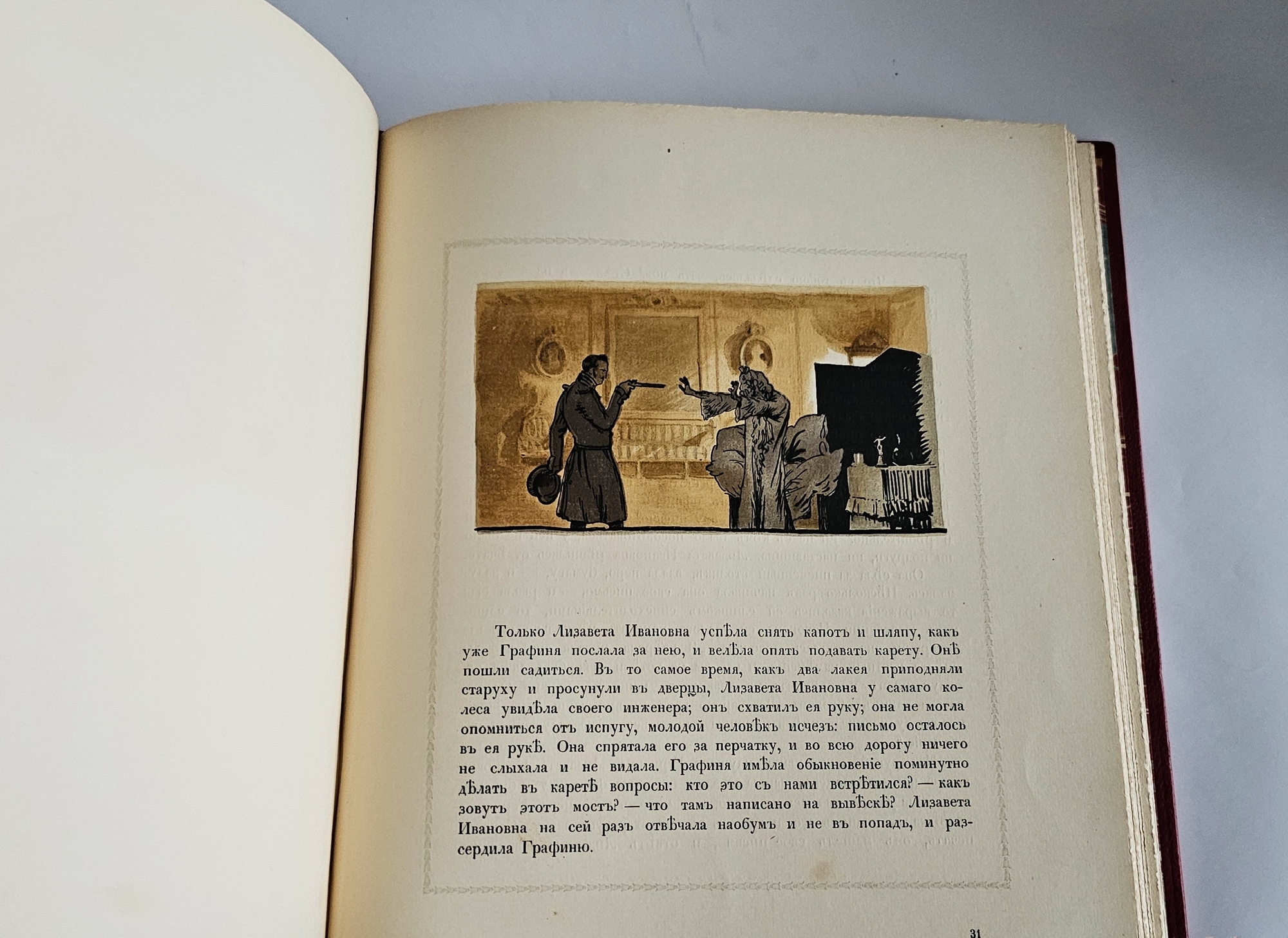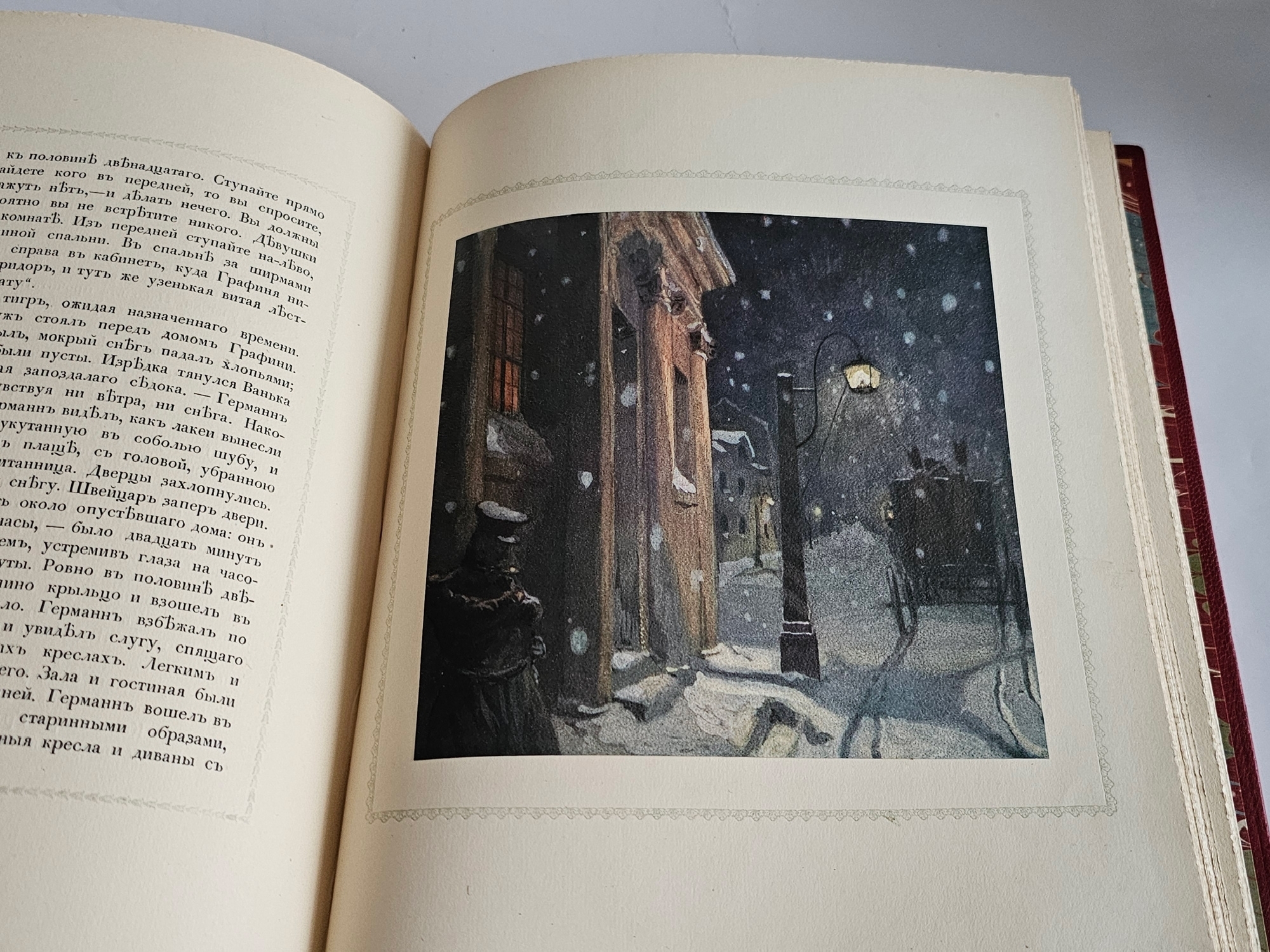Лучшее дореволюционное издание повести Александра Сергеевича Пушкина «Пиковая дама», выпущенное знаменитой типографией поставщиков Его Императорского Величества Р.Голике и А.Вильборг, отпечатанное на высококачественной вержированной бумаге ручной выделки. С иллюстрациями Александра Н.Бенуа.