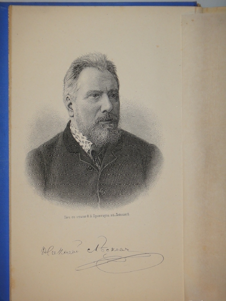 На фронтисписе первого тома помещён гравированный погрудный портрет писателя, печатаный со стали Ф.А.Брокгаузом в Лейпциге. Портрет снабжён собственноручной факсимильной подписью автора и проложен прозрачной защитной калькой. Критико-биографический очерк - Николай Семёнович Лесков - составлен русским публицистом, издателем, литературным критиком Р.И.Сементковским.