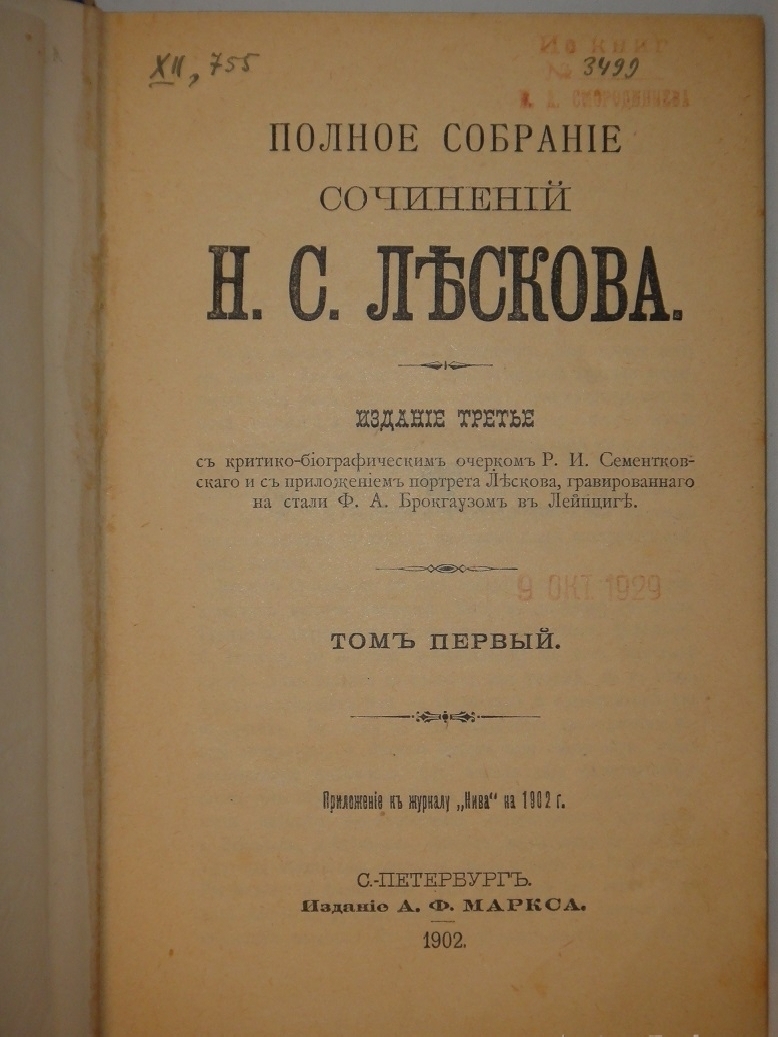 Том 1. Критико-биографический очерк Р.И.Сементковского " Николай Семенович Лесков ". - Соборяне. ( Хроника ). Часть 1. 1902. 189 стр.; один лист портрет.
