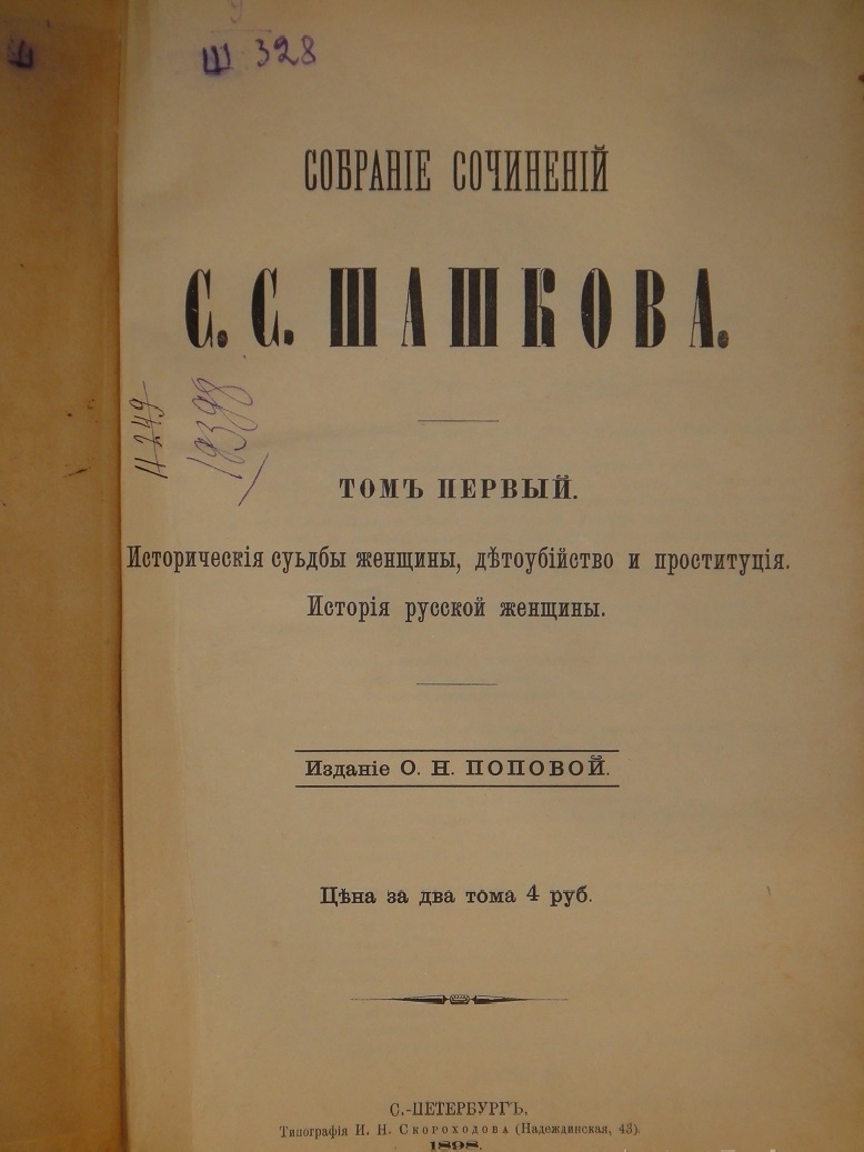 Том 1. Книга первая. Исторические судьбы женщины, детоубийство и проституция. Книга вторая. История русской женщины. Приложение: Образчик семейного " жития непорядочного " в старинной России. [4], IV, 894 столбцов; портрет.