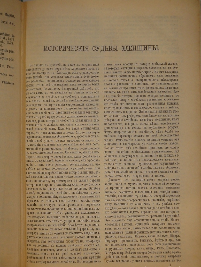 Первый том - включает в себя три книги. Книга первая - самая обширная. Она посвящена историческим судьбам женщины и содержит 21 главу, в которых освещается история эмансипации, начиная с первобытных времён и до XIX века включительно. Автор рассказывает о первобытном браке, полиандрии и гинекократии в первобытное время, развитии патриархальной системы, водворении моногамии, порабощении женщин с развитием восточных государств, борьбе восточных женщин за свою независимость. Говорится о борьбе мужчины и женщины в первичную эпоху греческой истории, положении женщины в Древнем Риме, христианстве и женщине, положении женщин при феодализме, в Средние века и эпоху Возрождения, влиянии католицизма на порабощении женщины, " эмансипации плоти ", дальнейшем стремлении женщины к свободе, её участии в общественной деятельности, а также постепенной эмансипации русской женщины в XVIII-XIX веках.