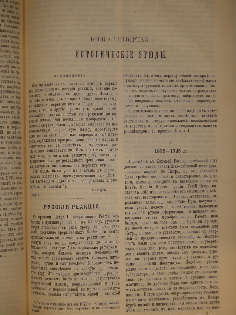 Второй том. Книга третья. Исторические очерки ( Старая и Новая Испания; Судьбы Ирландии; Эдмунд Бёрк; Газетная пресса в Англии ). Книга четвёртая. Исторические этюды ( Русские реакции с 1698-1861гг.; Рабство в Сибири; Сибирские инородцы в XIX столетии; Иркутский погром в 1758-1760гг. и др. ).