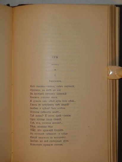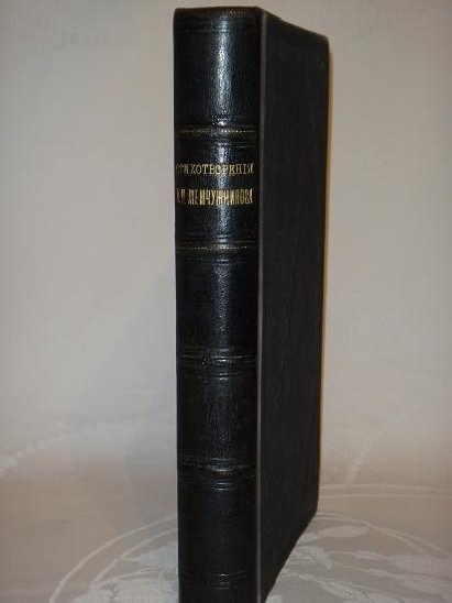Экземпляр в красивом строгом полукожаном переплёте работы известного мастера переплётного искусства дореволюционной России Давида Менделя. Круглёный корешок украшен четырьмя декоративными бинтами и золотым художественным тиснением. Крышки обрамлены симметричными наборными конгревными рамками с ажурными виньетками в уголках. На передней крышке, тиснёное глубоким блинтом, имя автора.