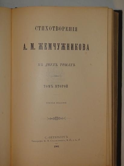 В 1892 году в Петербурге поэт выпустил свой первый сборник: " Стихотворения А.М.Жемчужникова ". В первый том вошли лирические стихотворения, стихотворные фельетоны, притчи, эпитафии, заметки, песни, эпиграммы ( всего 146 произведений ). Во второй - поэмы, комедии в стихах и сцены ( 14 произведений ). Это издание появилось в результате тщательной авторской подготовки текстов. В первый том не были помещены юношеские стихи, в силу своей слабости, и также те, которые автор посчитал несвоевременными. Иные не были включены по цензурным соображениям.