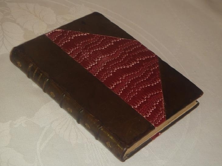 Книга в великолепном старинном полукожаном марокеновом переплёте с золотым узорным тиснением на бинтовом корешке. Крышки с большими углами оклеены бумагой - под павлинье перо, форзацы - светлой вержированной бумагой.
