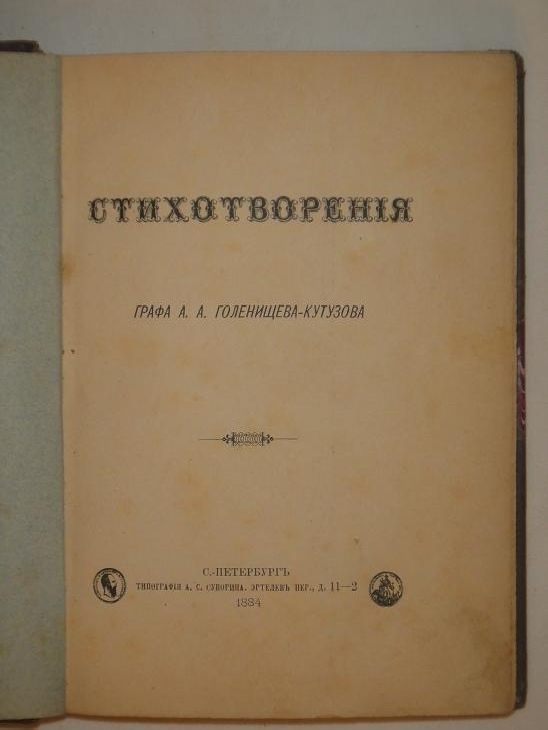 Граф Арсений Аркадьевич Голенищев-Кутузов ( 1848, Царское Село - 1913, Петербург ) - русский поэт, прозаик, публицист, почётный академик. Происходил из знаменитого дворянского и графского рода. После смерти отца в 1859г. переехал в Москву, где в 1865 окончил с золотой медалью 4-ю гимназию и учился на юридическом факультете Московского университета. В 1869г. продолжил обучение в Петербургском университете, который окончил в 1871г. со степенью кандидата прав. Служил в Государственной канцелярии. В 1889г. - управляющий государственным дворянским и крестьянским поземельными банками. С 1895г. возглавлял личную канцелярию Императрицы Марии Фёдоровны.