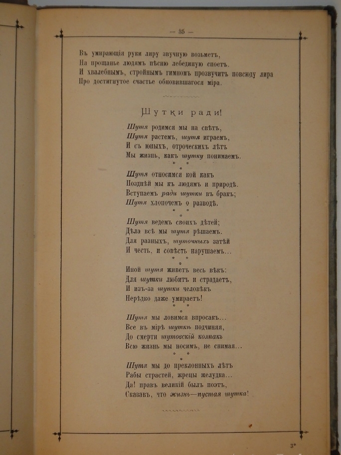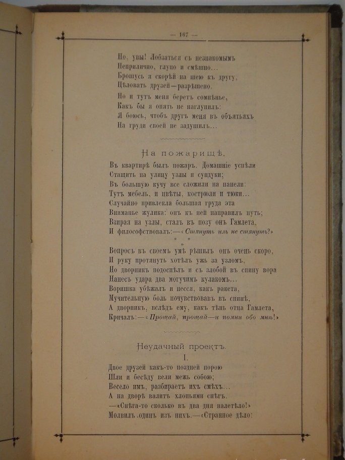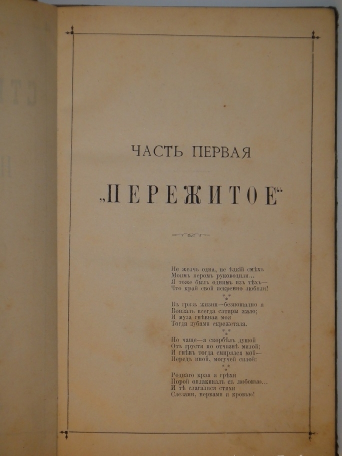 В 1886 году в Москве выпустил свою первую книгу " Стихотворения ". Она условно разделена на две части: Пережитое ( 75 лирических стихотворений ) и Между делом ( 82 юмористических ). Благодаря лёгкости стиха, меткости выражений и тонкой иронии, книге сопутствовал успех не только у читающей публики, но и у критиков. При небольшом тираже она была быстро раскуплена и сделалась редкостью уже в то время.