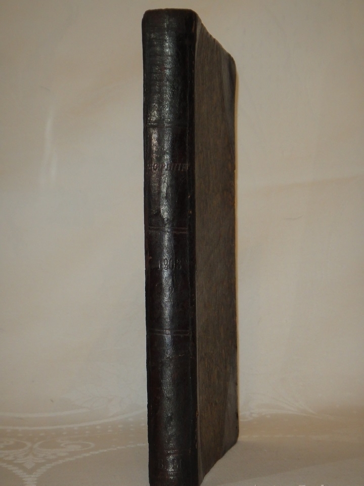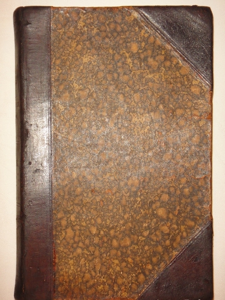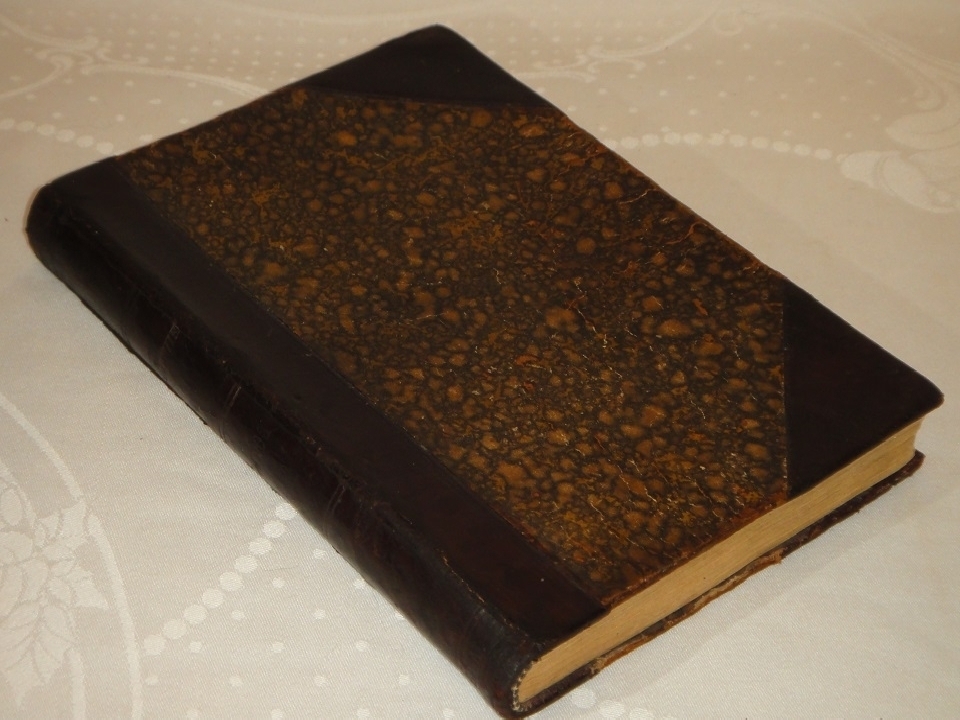 Экземпляр в добротном владельческом полукожаном переплёте эпохи с блинтовым тиснением на корешке. Крышки с большими углами оклеены бумагой под мрамор. Шёлковое ляссе.