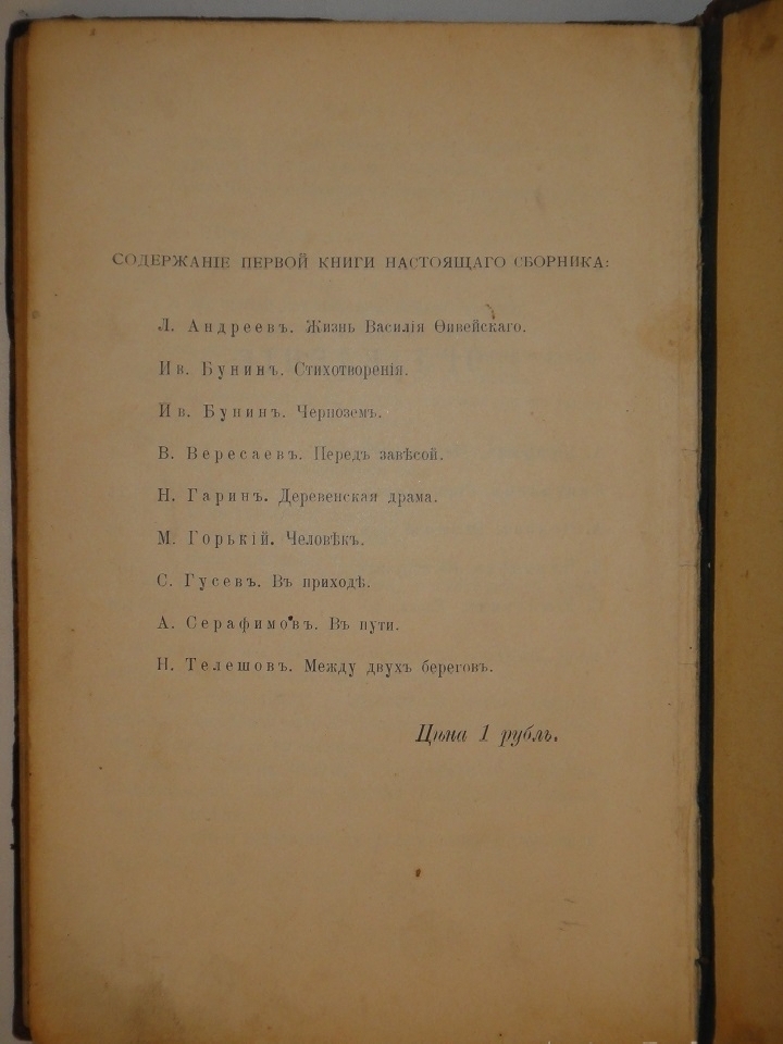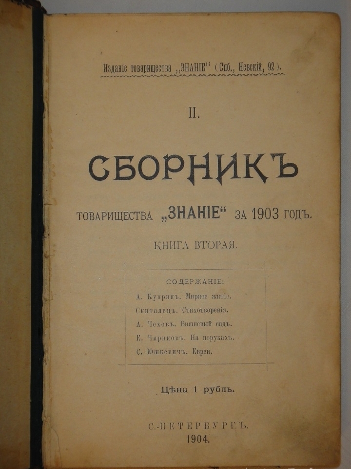 Сборник включает произведения пяти авторов: А.Чехов " Вишнёвый сад "; А.Куприн " Мирное житие "; Скиталец " Стихотворения "; Е.Чириков " На поруках "; С.Юшкевич " Евреи ".