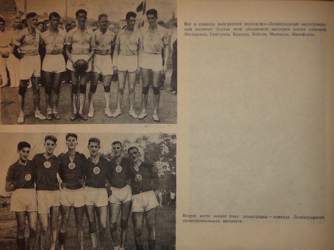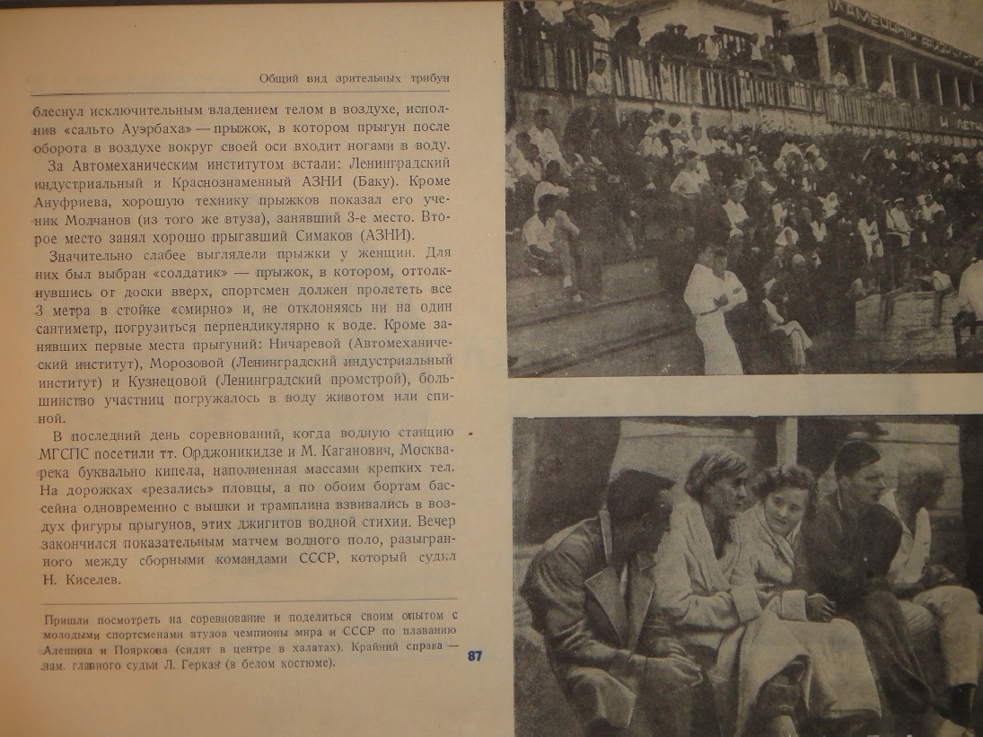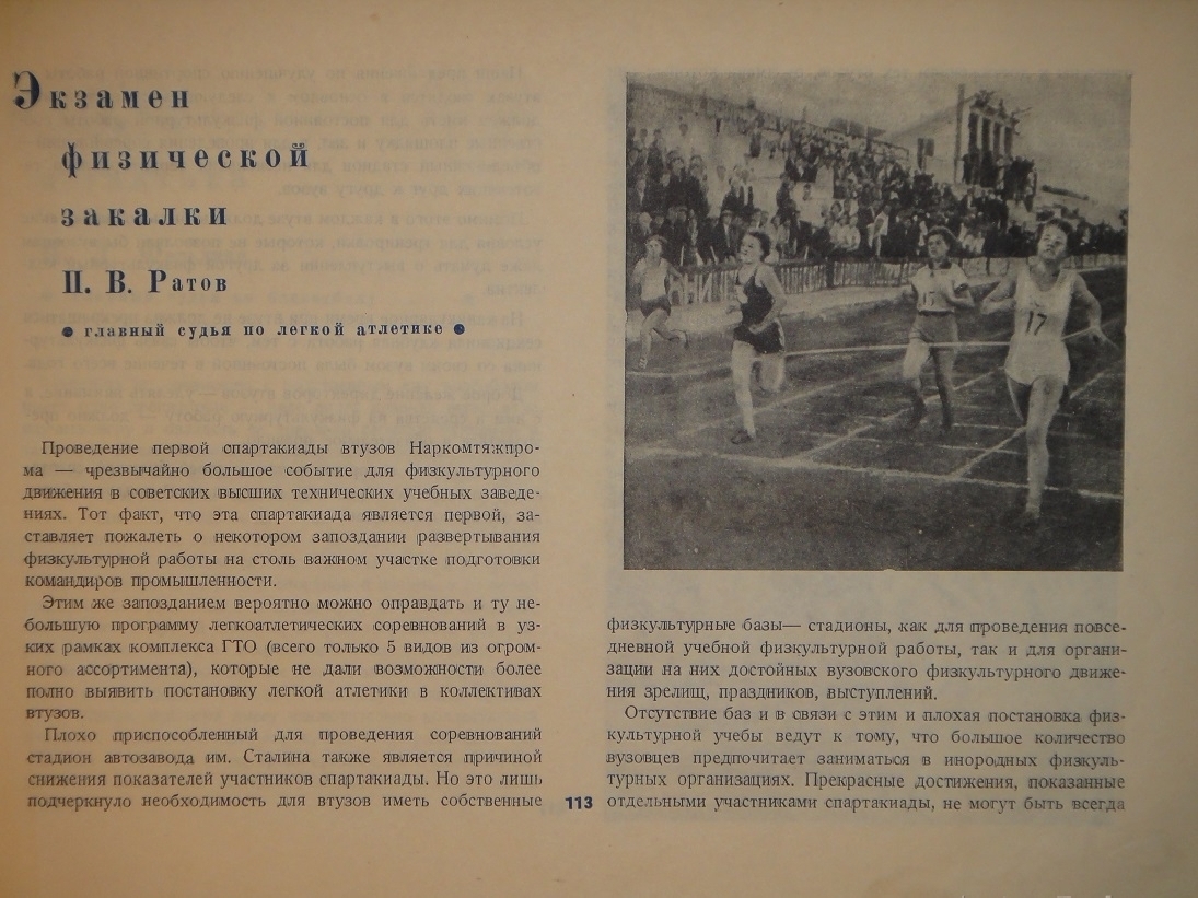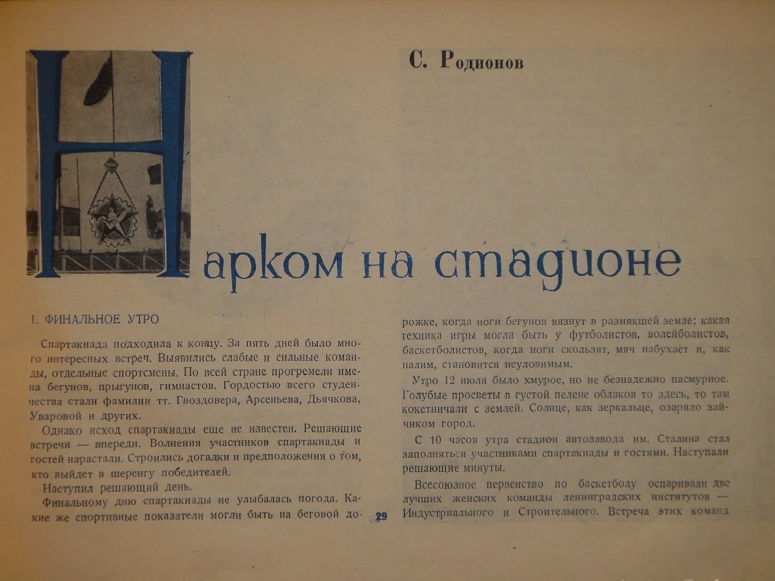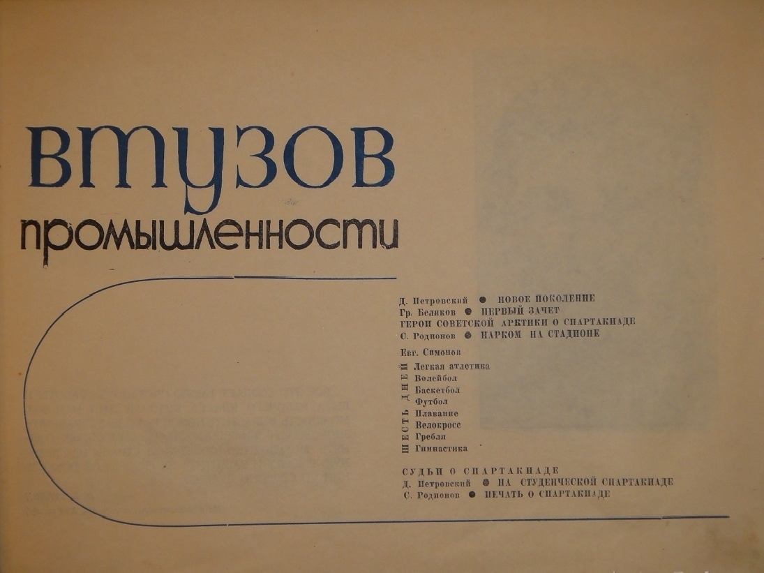 Содержание. Первая Всесоюзная Спартакиада ВТУЗов тяжелой промышленности: Д.Петровский " Новое поколение ". - Г.Беляков " Первый зачет ". - Герои советской Арктики о Спартакиаде. - С.Родионов " Нарком на стадионе ". - Е.Симонов " Шесть дней ": На беговых дорожках ( Легкая атлетика ); С мячом у сетки ( Волейбол ); Мяч в кольце ( Баскетбол ); Мяч у ворот ( Футбол ); На плотах " Динамо " ( Плавание ); На советских машинах ( Велокросс ); На веслах в противогазах ( Гребля ); Аттестат зрелости ( Гимнастика ). - Судьи о Спартакиаде. - Д.Петровский " На студенческой Спартакиаде ". - С.Родионов " Печать о спартакиаде ". - Статистические данные и показатели.