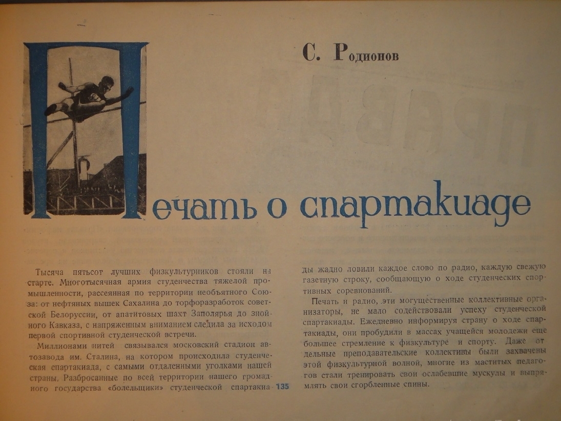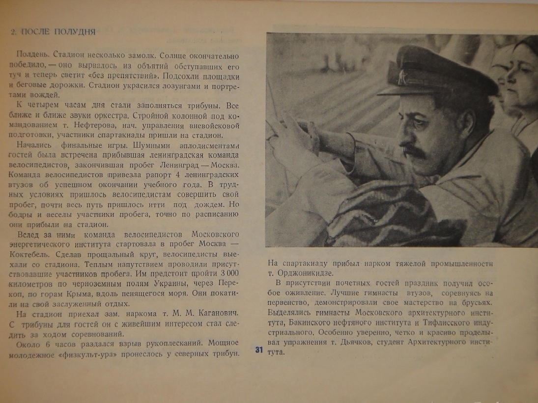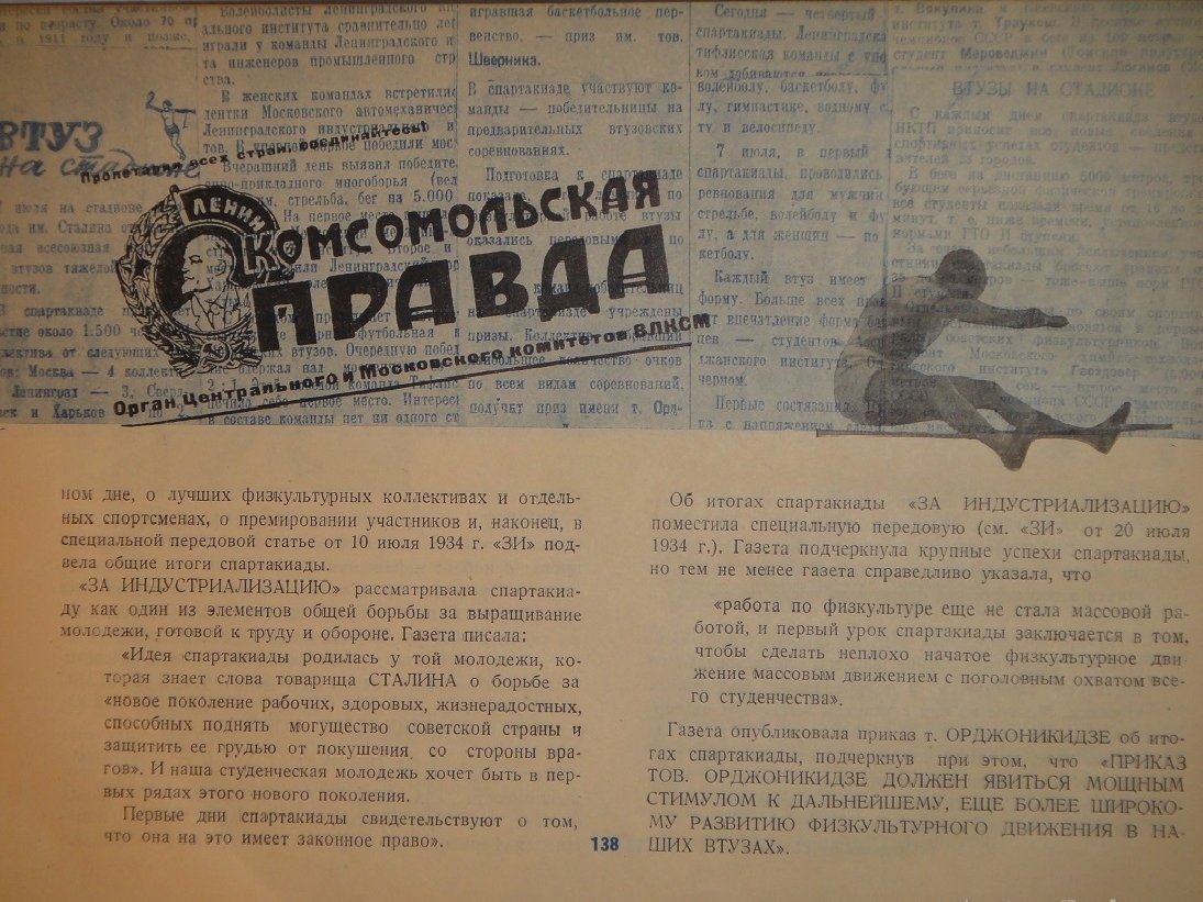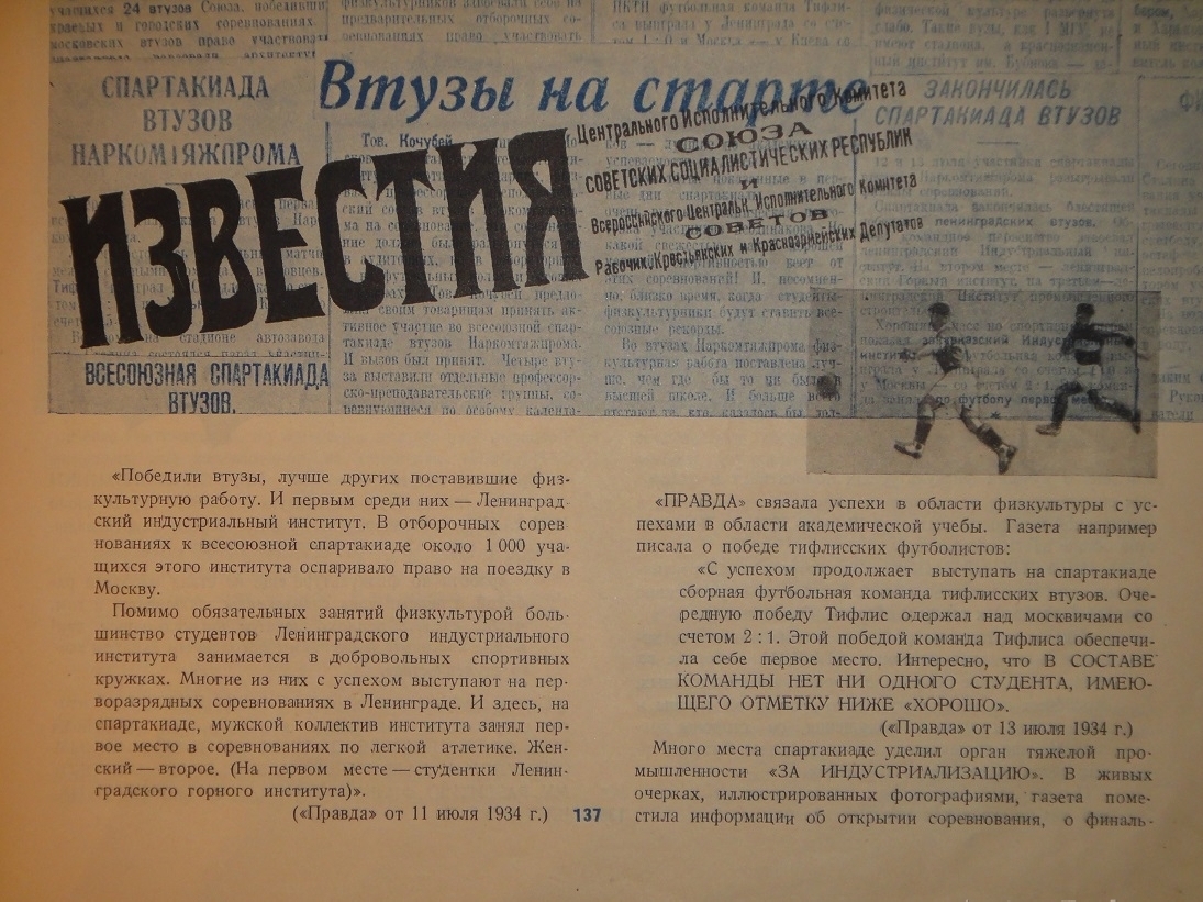 Из статьи в газете " Правда " от 08.07.1934 года: " Вчера на стадионе Автозавода им. Сталина открылась первая Всесоюзная Спартакиада ВТУЗов тяжёлой промышленности. На зелёном квадрате футбольного поля выстроились студенты-физкультурники 25-ти ВТУЗов Наркомтяжпрома. Тт. Горшенин ( ЦК ВЛКСМ ), Аболин ( ВЦСПС ), Григорьев ( Высший совет физической культуры ), Петровский ( начальник Главного управления учебными заведениями НКТП ) и другие обходят колонну физкультурников, приветствуя участников спартакиады. Короткий митинг. Товарищ Петровский объявляет Спартакиаду открытой. На беговую дорожку выходят первые спринтеры...".