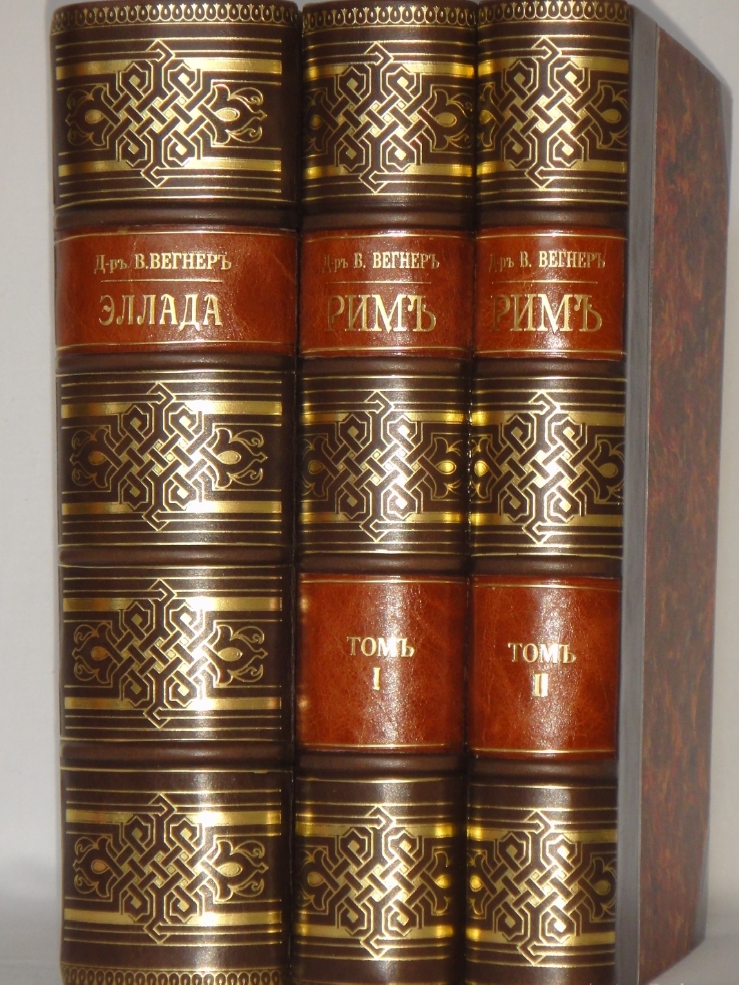 Экземпляр в двух эксклюзивных современных полукожаных переплётах с углами и золотым орнаментальным тиснением на бинтовых корешках и контрастных декоративных вставках.
