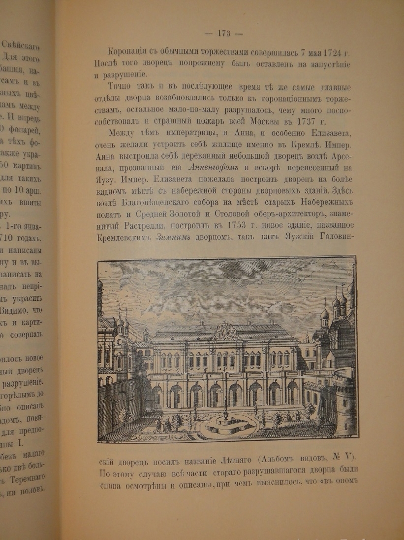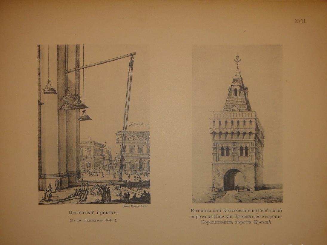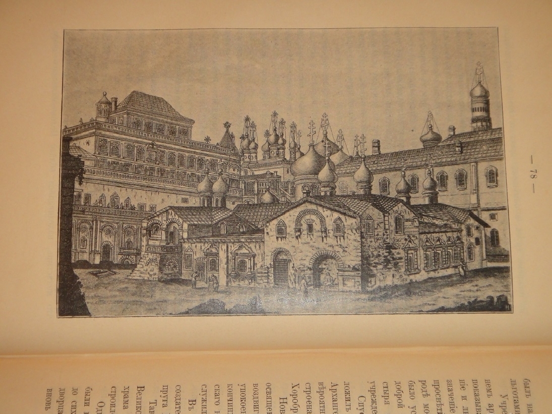 Книга украшена 8-ью рисунками в тексте, из которых пять текстовые и три полностраничные: Вид теремов и церкви Спаса на Бору. - Внутренний вид Грановитой палаты после пожара 1812 года. - Вид на Кремль и Троицкий мост, снятый с самом начале XVIII столетия. - Красное Крыльцо и Грановитая палата. - Вид Нового дворца в Кремле с южной стороны. - Новый Императорский дворец с галереями Старого дворца. - Никольские ворота в Кремле с частью Цейхгауза ( Арсенала ). - Воскресенские ворота между Библиотекою и Монетным двором.