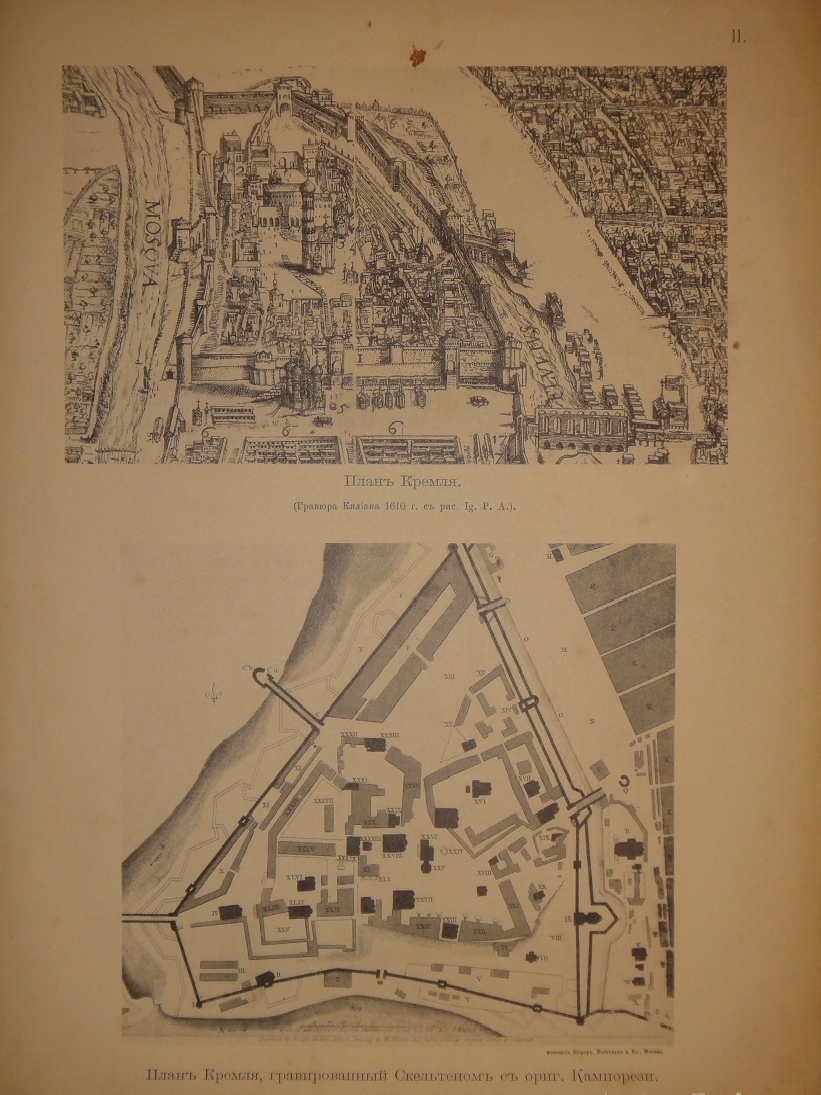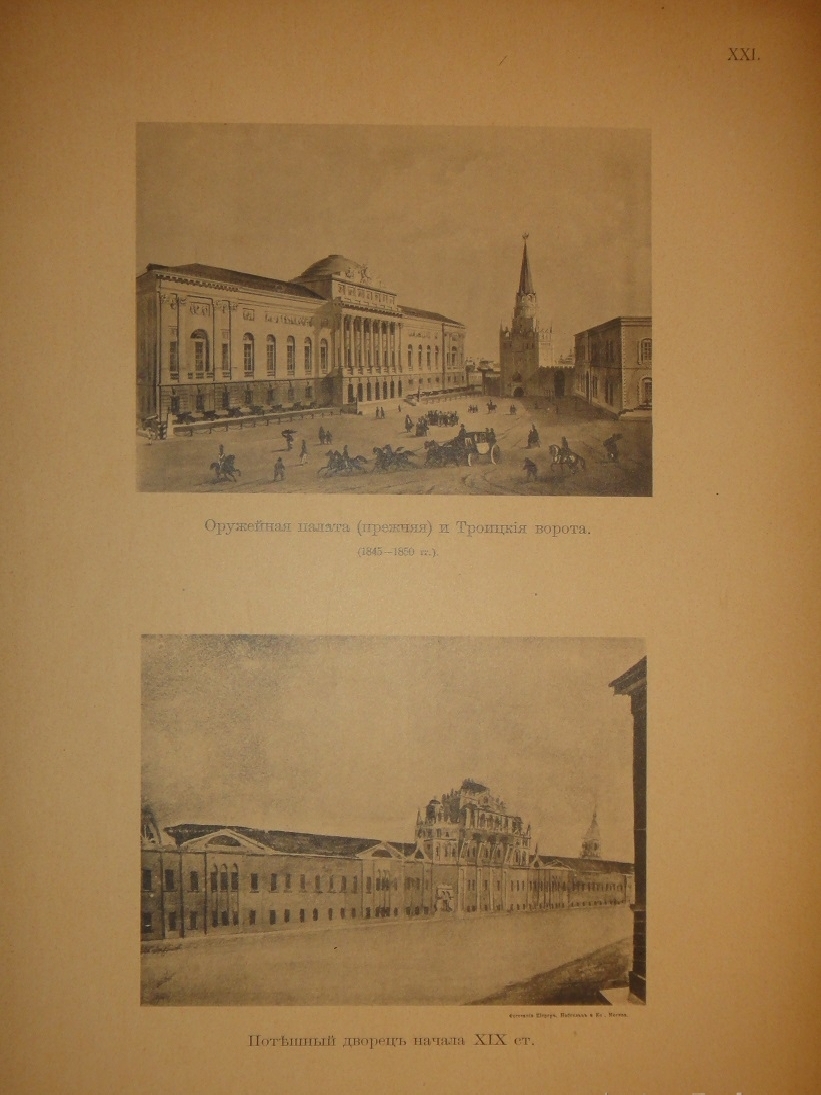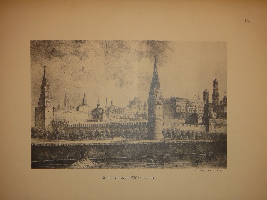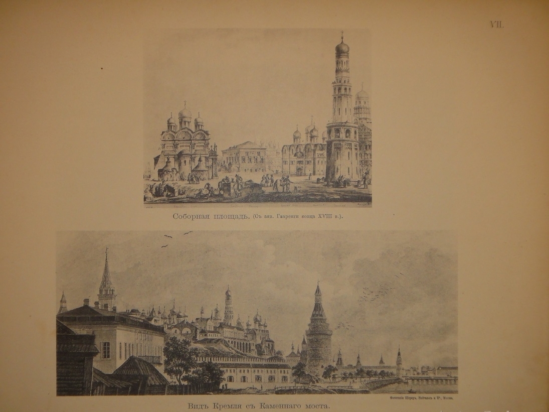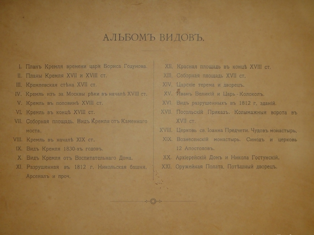 Альбом видов: I. План Кремля времени царя Бориса Годунова. - II. Планы Кремля XVII и XVIII ст. - III. Кремлёвская стена XVII ст. - IV. Кремль из-за Москвы реки в начале XVIII ст. - V. Кремль в половине XVIII ст. - VI. Кремль в конце XVIII ст. - VII. Соборная площадь. Вид Кремля от Каменного моста. - VIII. Кремль в начале XIX ст. - IX. Вид Кремля 1830-х годов. - X. Вид Кремля от Воспитательного Дома. - XI. Разрушенная в 1812 году Никольская башня, Арсенал и проч. - XII. Красная площадь в конце XVIII ст. - XIII. Соборная площадь XVII ст. - XIV. Царские терема и дворец. - XV. Иван Великий и Царь-Колокол. - XVI. Вид разрушенных в 1812 году зданий. - XVII. Посольский Приказ. Колымажные ворота в XVII ст. - XVIII. Церковь Св. Иоанна Предтечи. Чудов монастырь. - XIX. Вознесенский монастырь. Синод и церковь 12 Апостолов. - XX. Архиерейский Дом и Никола Гостунский. - XXI. Оружейная Палата. Потешный дворец.