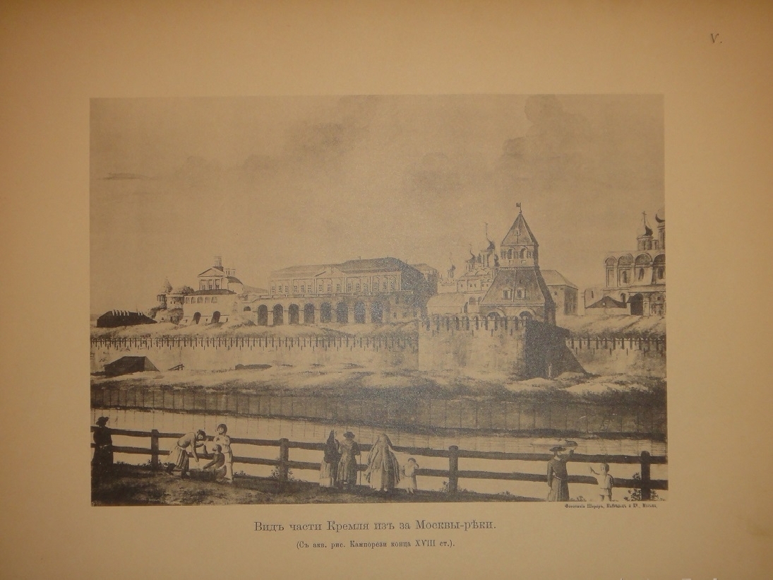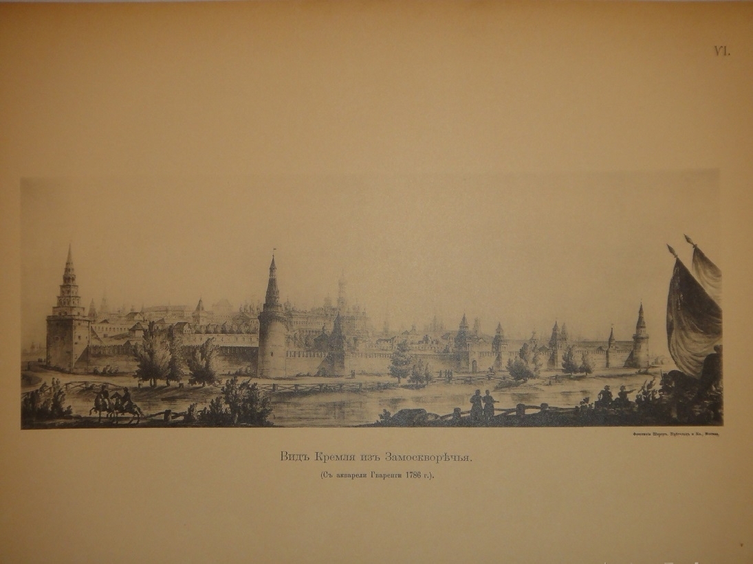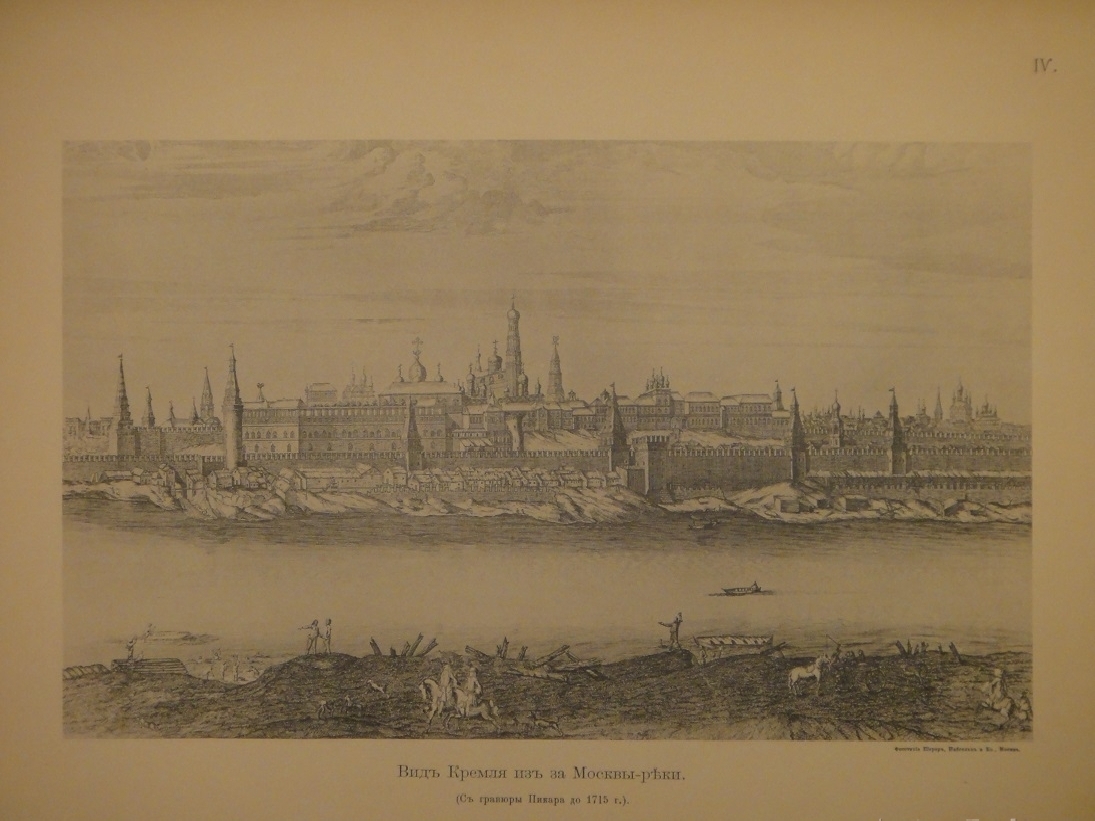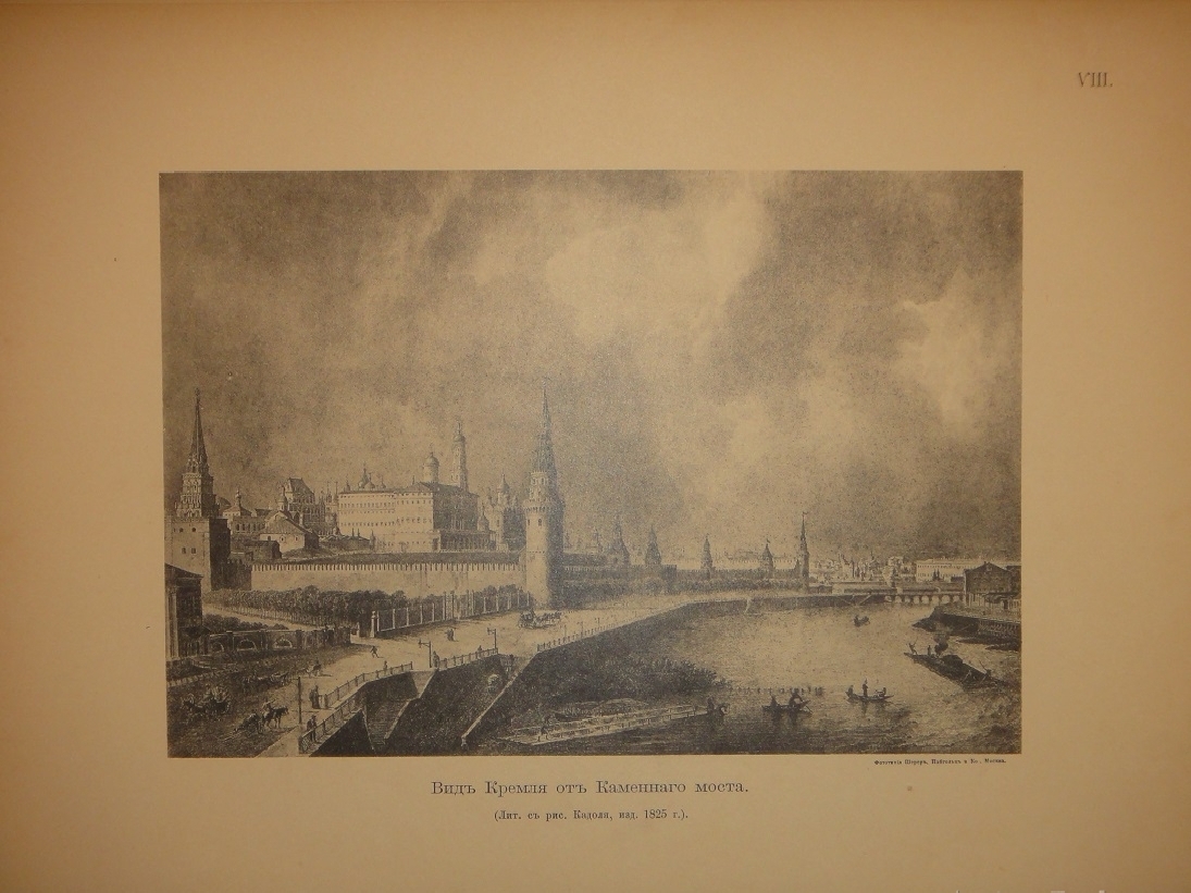 Альбом видов: I. План Кремля времени царя Бориса Годунова. - II. Планы Кремля XVII и XVIII ст. - III. Кремлёвская стена XVII ст. - IV. Кремль из-за Москвы реки в начале XVIII ст. - V. Кремль в половине XVIII ст. - VI. Кремль в конце XVIII ст. - VII. Соборная площадь. Вид Кремля от Каменного моста. - VIII. Кремль в начале XIX ст. - IX. Вид Кремля 1830-х годов. - X. Вид Кремля от Воспитательного Дома. - XI. Разрушенная в 1812 году Никольская башня, Арсенал и проч. - XII. Красная площадь в конце XVIII ст. - XIII. Соборная площадь XVII ст. - XIV. Царские терема и дворец. - XV. Иван Великий и Царь-Колокол. - XVI. Вид разрушенных в 1812 году зданий. - XVII. Посольский Приказ. Колымажные ворота в XVII ст. - XVIII. Церковь Св. Иоанна Предтечи. Чудов монастырь. - XIX. Вознесенский монастырь. Синод и церковь 12 Апостолов. - XX. Архиерейский Дом и Никола Гостунский. - XXI. Оружейная Палата. Потешный дворец.