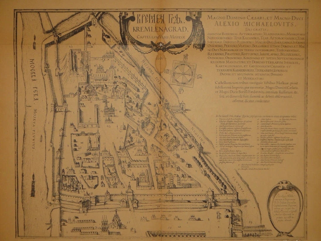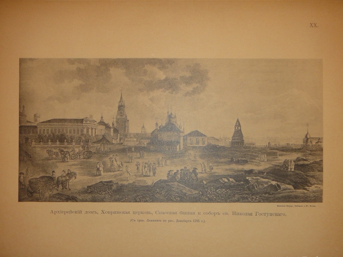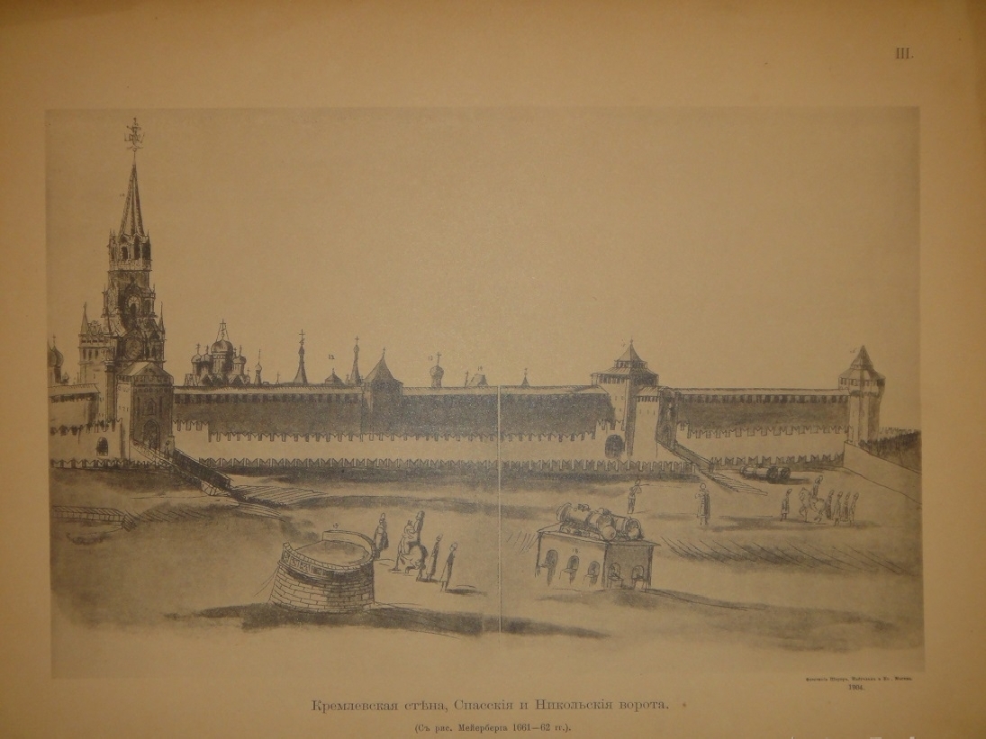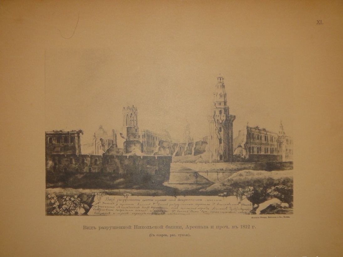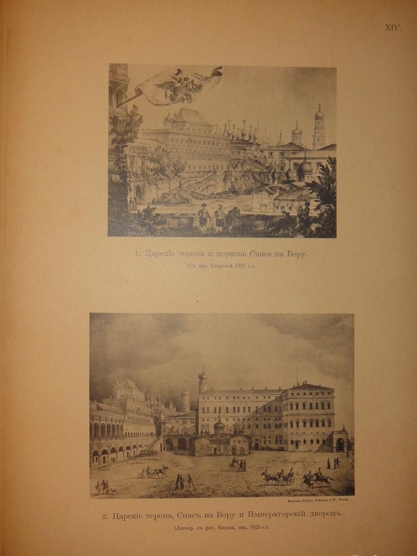 Альбом видов: I. План Кремля времени царя Бориса Годунова. - II. Планы Кремля XVII и XVIII ст. - III. Кремлёвская стена XVII ст. - IV. Кремль из-за Москвы реки в начале XVIII ст. - V. Кремль в половине XVIII ст. - VI. Кремль в конце XVIII ст. - VII. Соборная площадь. Вид Кремля от Каменного моста. - VIII. Кремль в начале XIX ст. - IX. Вид Кремля 1830-х годов. - X. Вид Кремля от Воспитательного Дома. - XI. Разрушенная в 1812 году Никольская башня, Арсенал и проч. - XII. Красная площадь в конце XVIII ст. - XIII. Соборная площадь XVII ст. - XIV. Царские терема и дворец. - XV. Иван Великий и Царь-Колокол. - XVI. Вид разрушенных в 1812 году зданий. - XVII. Посольский Приказ. Колымажные ворота в XVII ст. - XVIII. Церковь Св. Иоанна Предтечи. Чудов монастырь. - XIX. Вознесенский монастырь. Синод и церковь 12 Апостолов. - XX. Архиерейский Дом и Никола Гостунский. - XXI. Оружейная Палата. Потешный дворец.