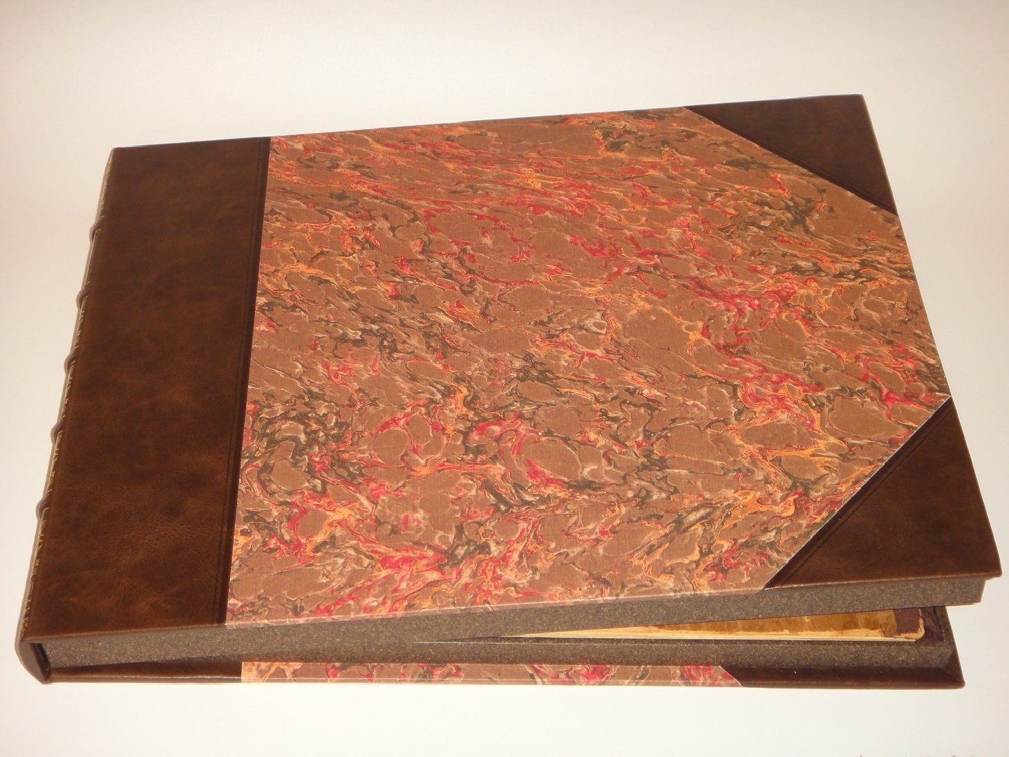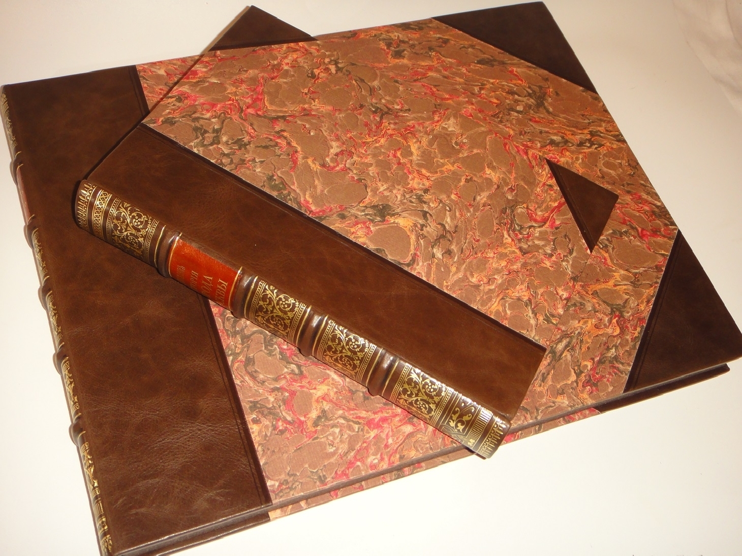 Экземпляр в превосходном полукожаном владельческом переплёте с золотым высокохудожественным тиснением на бинтовом корешке и контрастной декоративной вставке. Крышки с уголками оклеены - бумагой под мрамор, форзацы - плотной цветной бумагой. Краплёный обрез. Шёлковое ляссе.