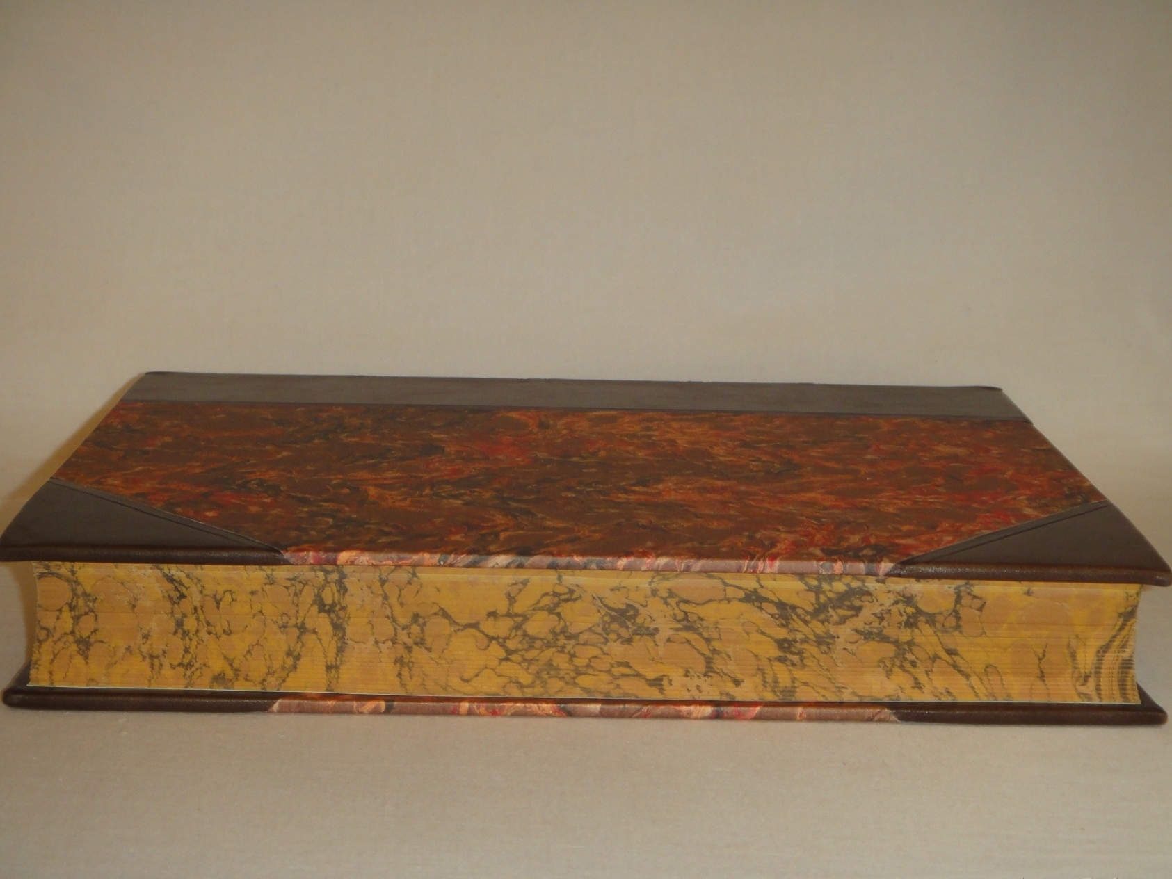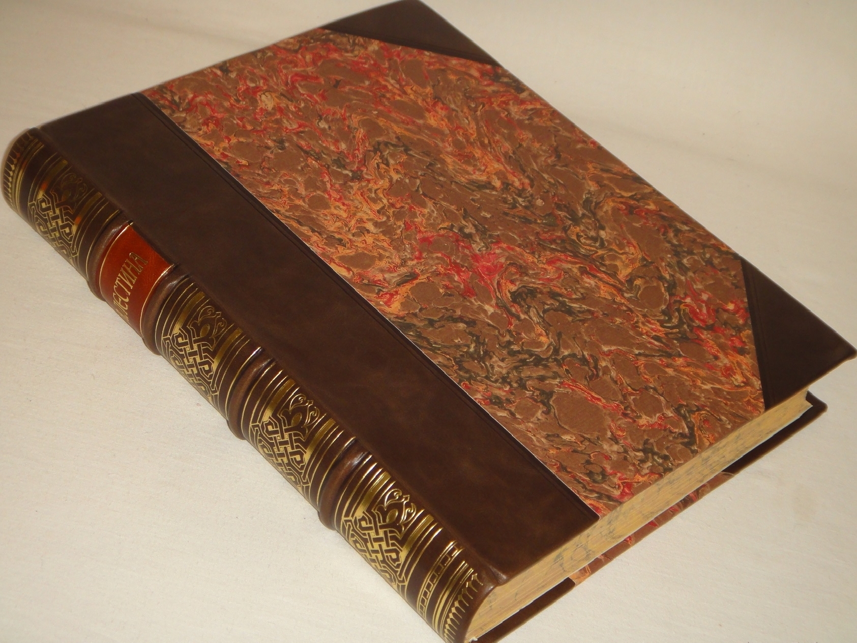 Экземпляр в роскошном владельческом полукожаном переплёте. Круглёный корешок украшен золотым узорным орнаментированным тиснением и контрастной декоративной наклейкой с названием издания. Крышки с большими кожаными углами оклеены мраморной бумагой.