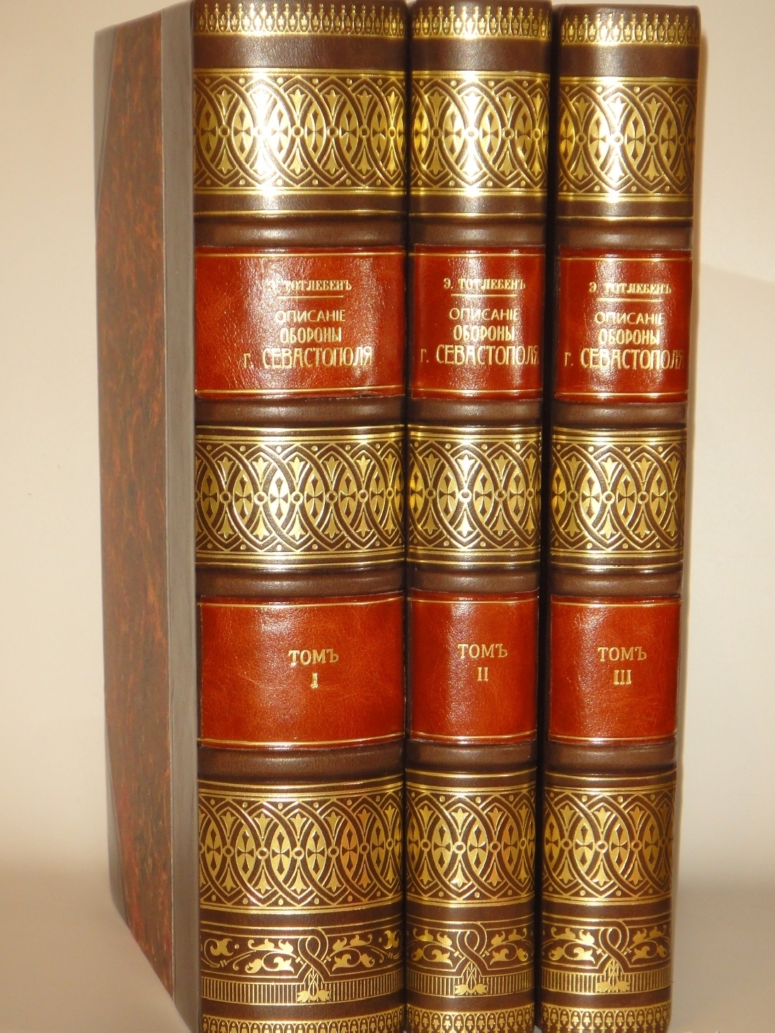 Экземпляр в великолепных полукожаных владельческих переплётах с золотым художественным тиснением на корешках и двух декоративных контрастных вставках между бинтами. Крышки с углами оклеены бумагой под мрамор.