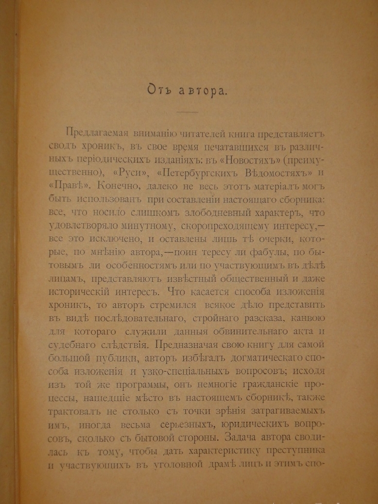 Автор очерков пытается понять мотивы преступлений, проанализировать психологию их участников. В очерках представлена своеобразная галерея " типов " дореволюционной России: нищие босяки из петербургских пригородов, искусный вымогатель-полицейский из Киева, кучер с Петербургской стороны, ревнивый дворник из питерских подворотен, витебские обыватели-евреи, британский подданный и графиня - похитители книг издателя А.Девриена, человек, выдававший себя за священника храма Гроба Господня, и многие другие.
