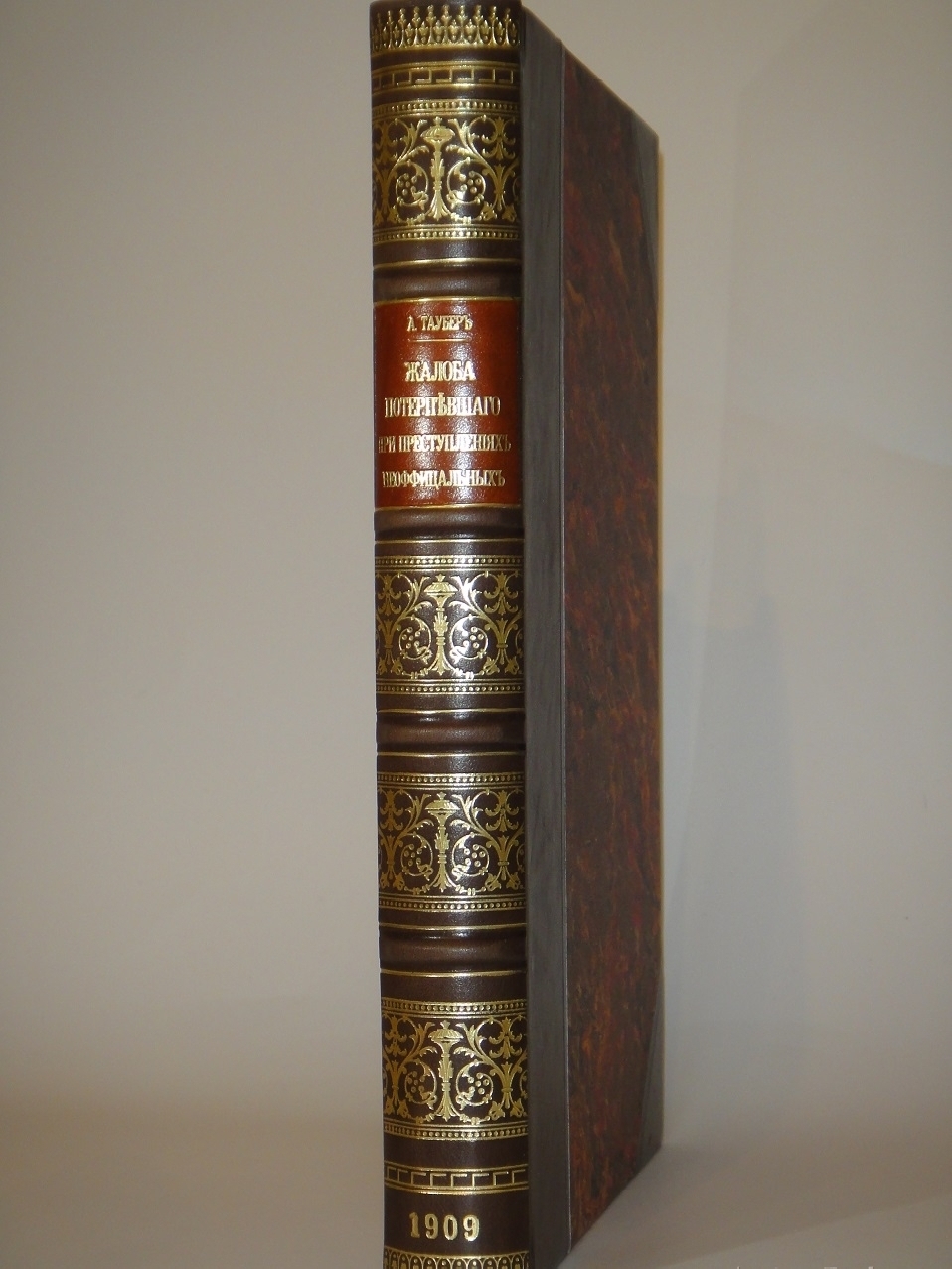 Экземпляр в превосходном полукожаном владельческом переплёте с золотым художественным тиснением на бинтовом корешке и контрастной декоративной вставке. Крышки с уголками оклеены - бумагой под мрамор, форзацы - плотной светлой бумагой. Краплёный обрез. Шёлковое ляссе.