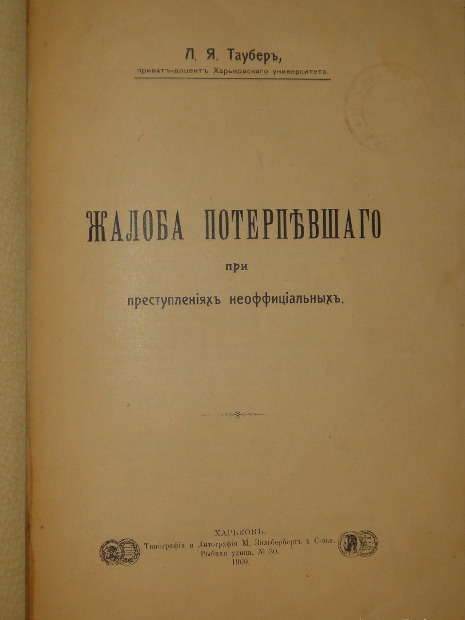 Леонид Яковлевич Таубер ( 1872, Харьков - 1943, Белград ) - авторитетный юрист, эксперт по уголовному праву, преподаватель уголовного судопроизводства в Харьковском университете. В разное время занимал должности городского судьи, судебного следователя и товарища прокурора в Харькове.